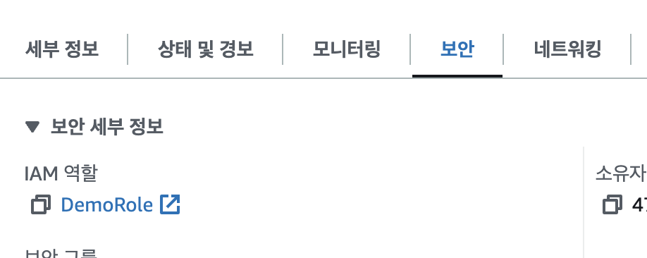 인스턴스 정보의 보안 탭에서 추가된 IAM권한을 확인 할 수 있다.