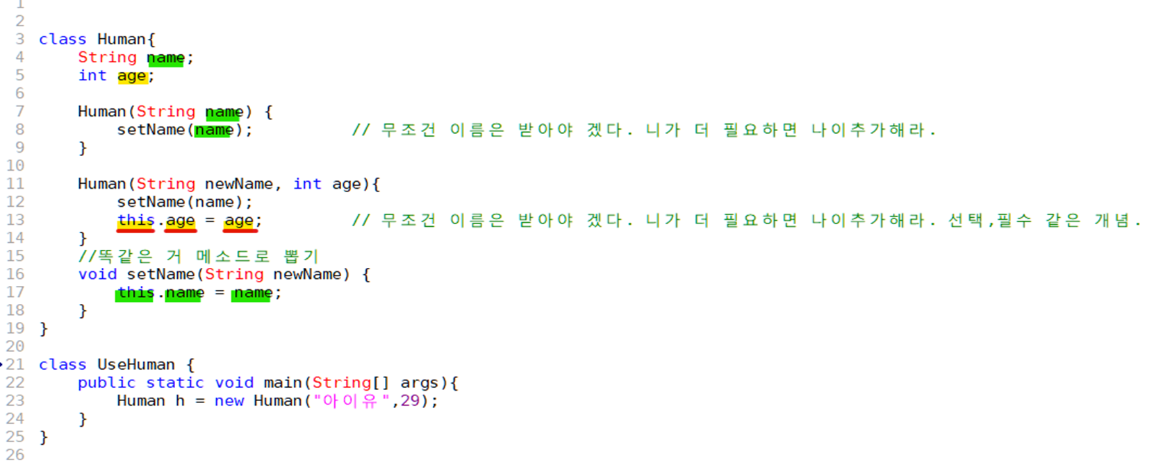 먜생각) this는 객체에 대한 참조값이기 때문에 아래 코드를 보면, Human의 객체의 멤버변수에 'this.'을 붙인다.