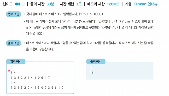 가장 왼쪽 위의 위치를 (1, 1), 가장 오른쪽 아래의 위치를 (n, m)이라고 할 때, 위 예시에서는 (2, 1) → (3, 2) → (3, 3) → (3, 4)의 위치로 이동하면 총 19만큼의 금을 채굴할 수 있으며, 이때의 값이 최댓값입니다.