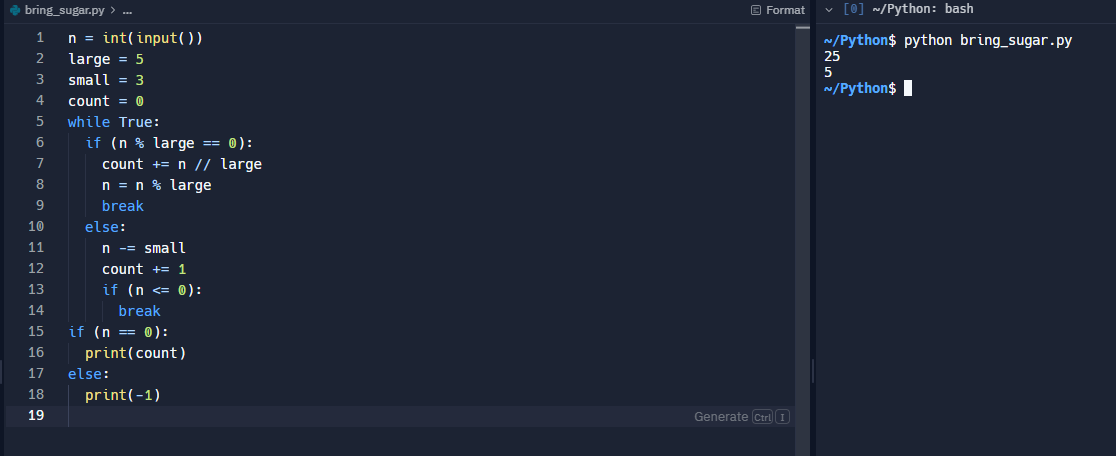 최대한 5를 많이 줄이고, 그 후 3을 하나씩 빼가면서 혹시라도 3으로 나눌 수 있는 상황을 대비하여 while문을 돌려가며 확인한다. 이를 통해 문제를 해결할 수 있다.