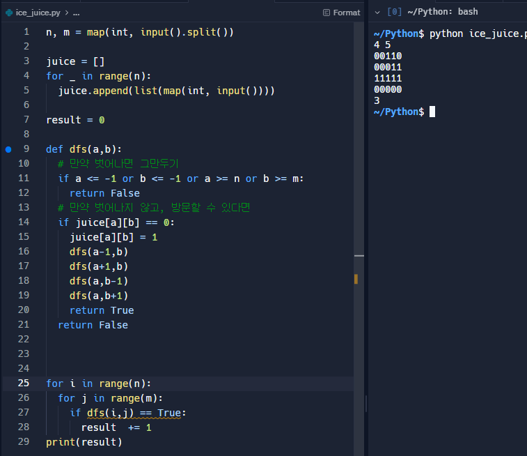 이때 얼음 틀의 모양이 주어졌을 때 생성되는 총 아이스크림의 개수를 구하는 프로그램을 작성하라.