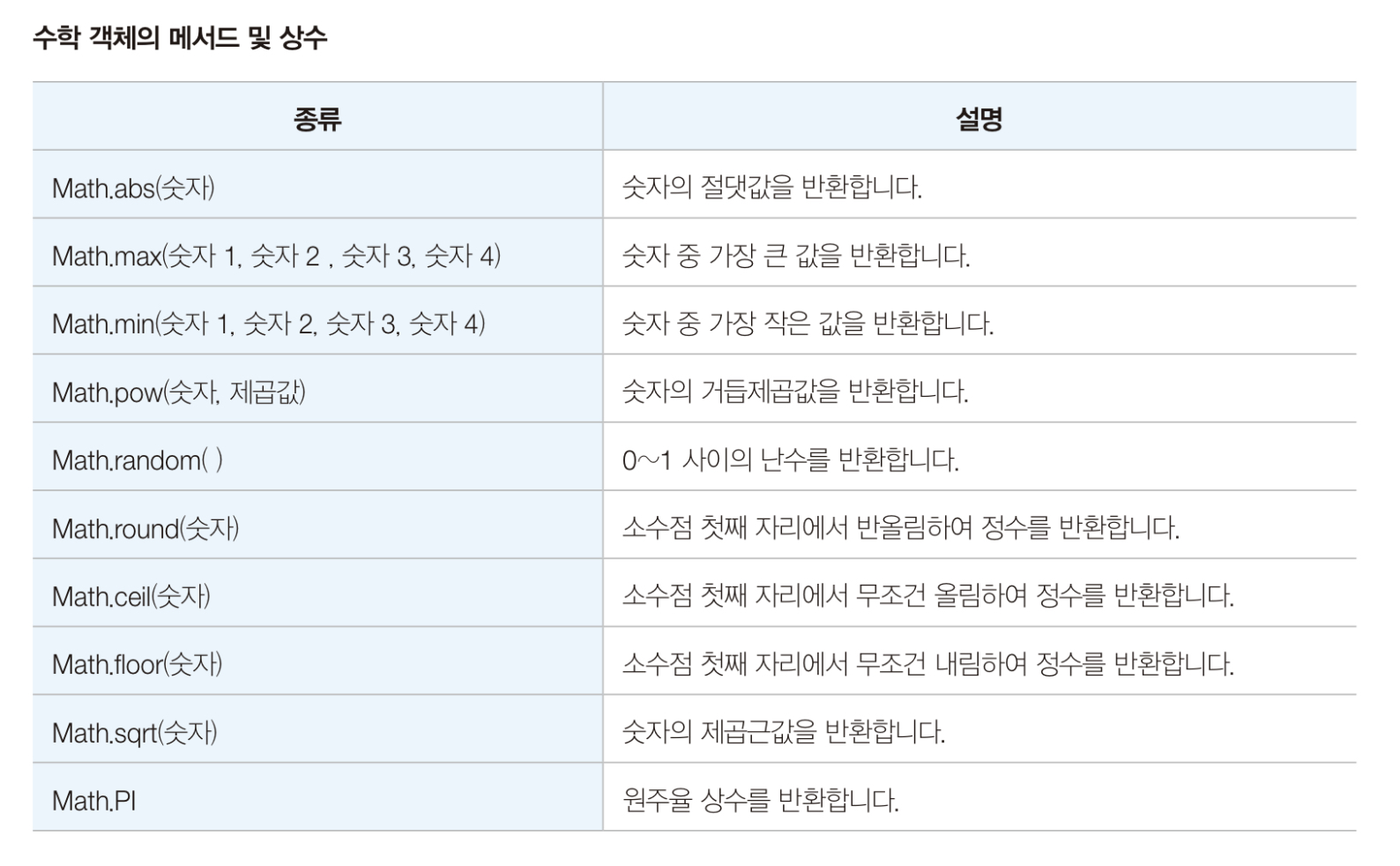 하지만 최댓값, 최솟값, 반올림값 등은 산술 연산자로 구할 수 없기 때문에 수학 객체 메서드를 이용해야함.