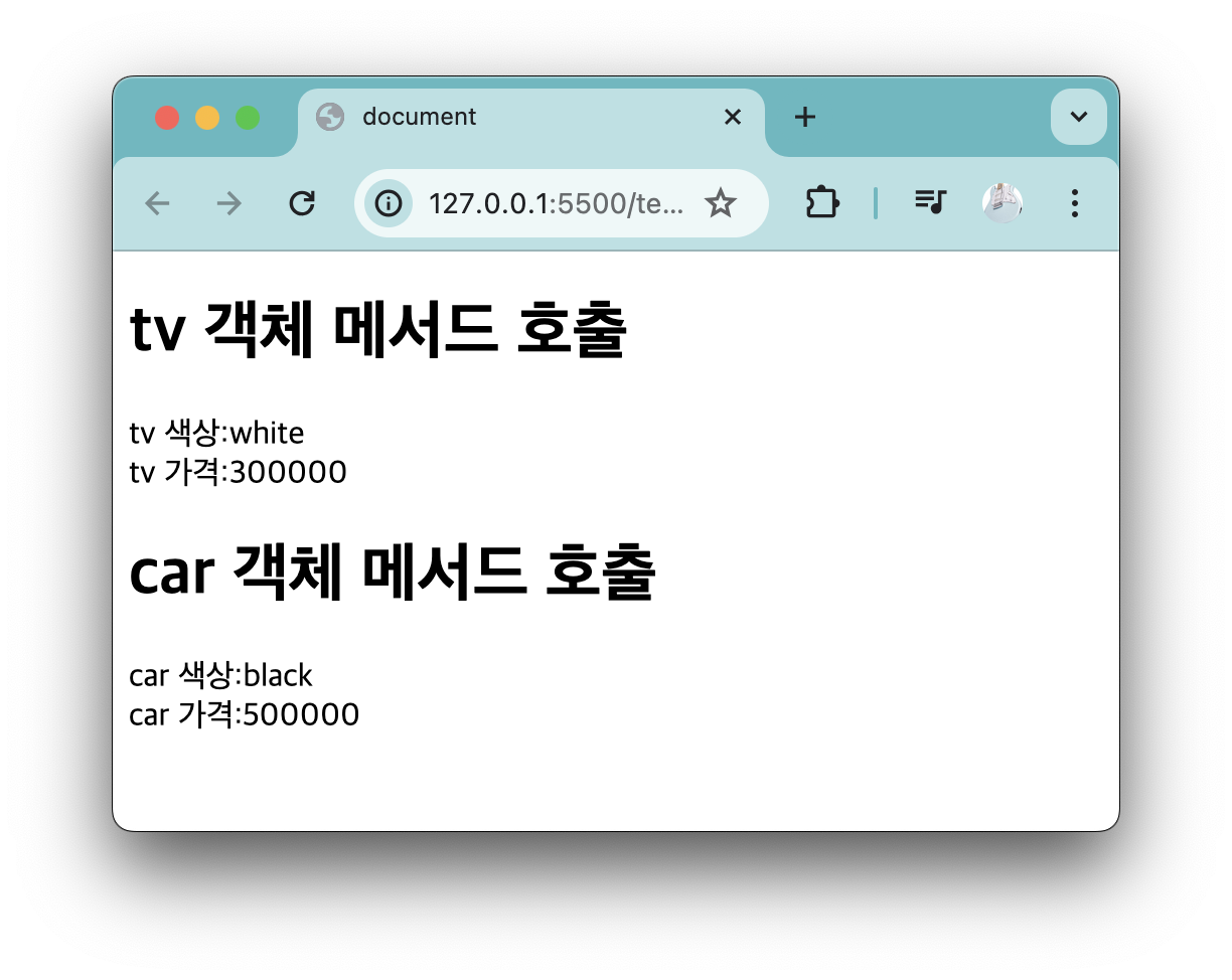 document.write("<h1> car 객체 메서드 호출 </h1>");
