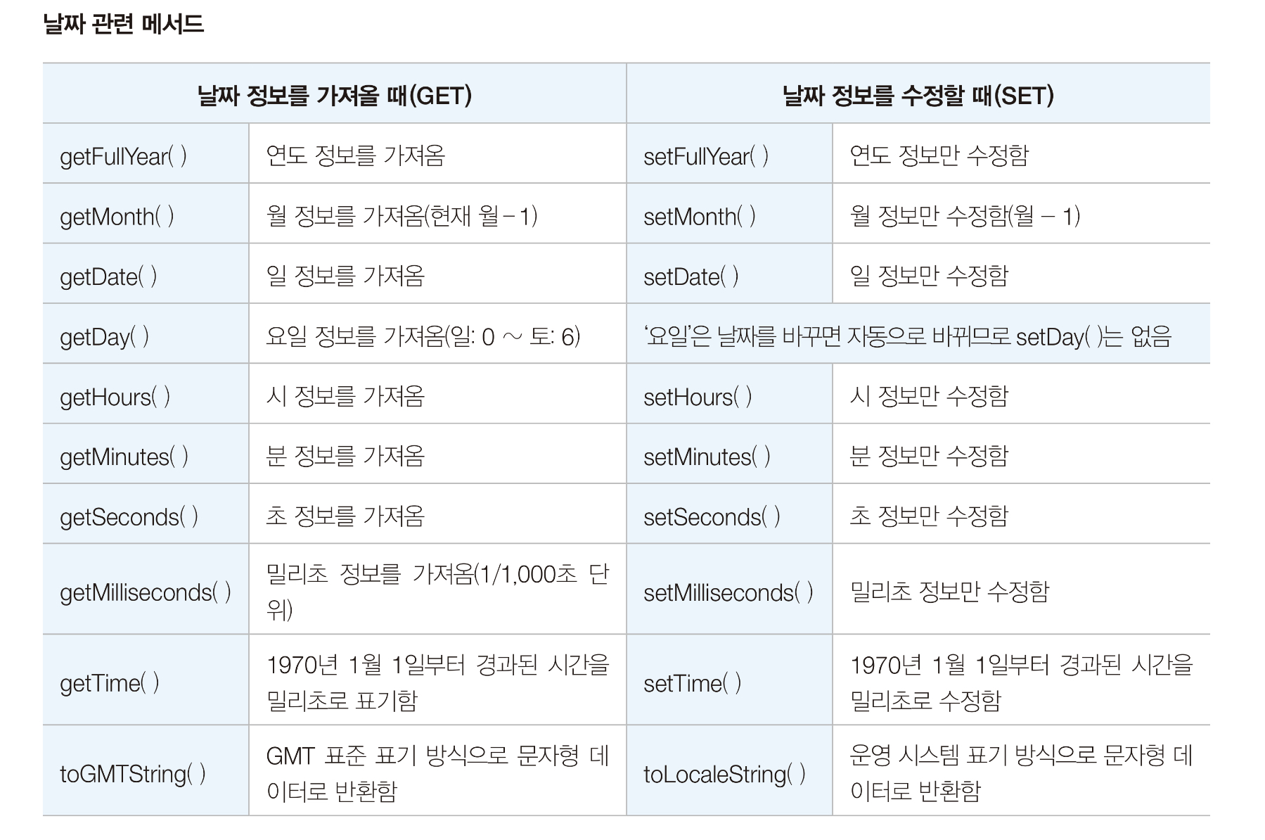 날짜나 시간 관련 정보를 제공받고 싶을 때 날짜 객체(Date Object)를 생성한다. 날짜 정보 객체는 날짜와 관련된 작업을 할 때 유용하다.