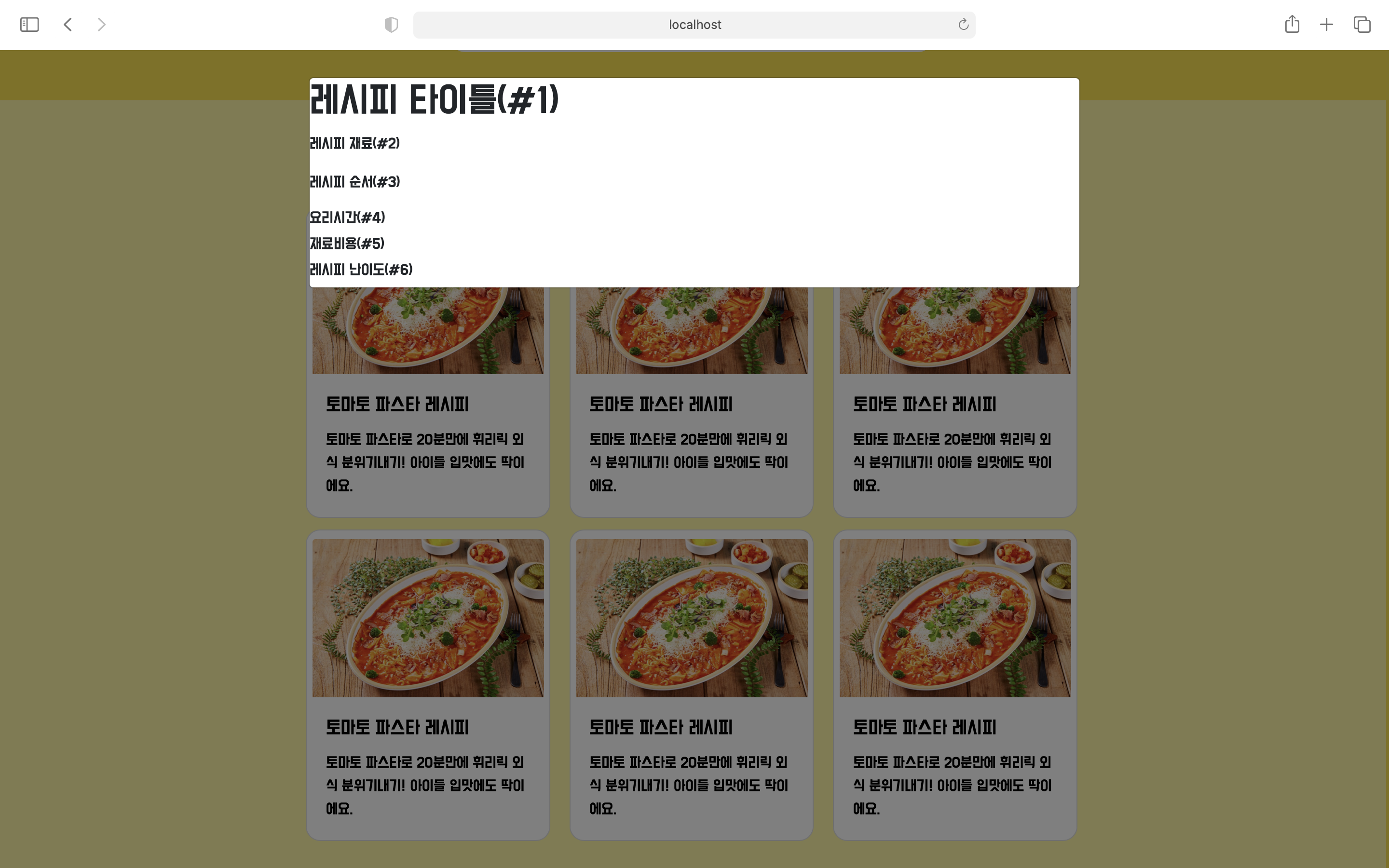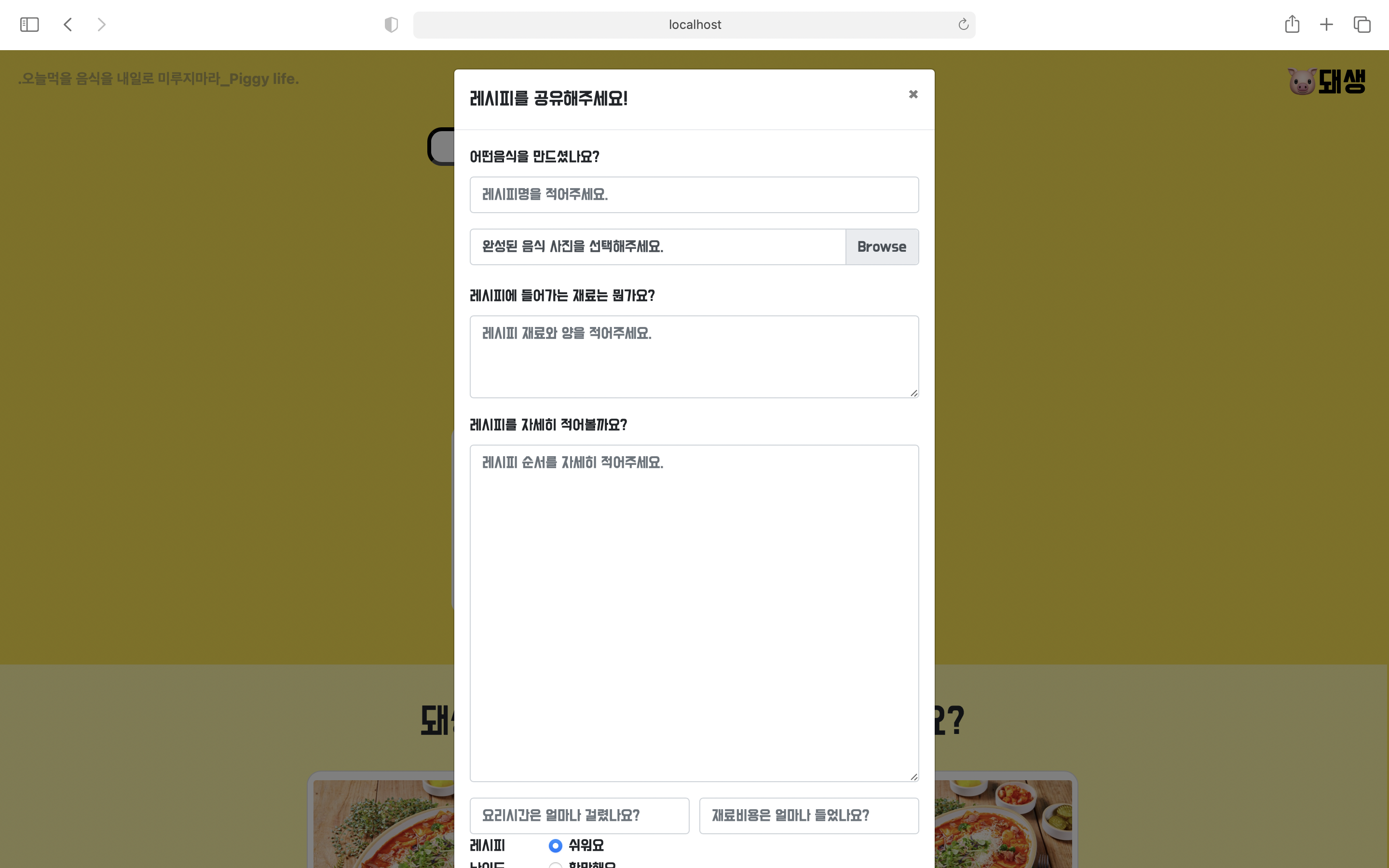 - 레시피 등록 부분을 다른 블로그에서 쓴 유저의 글을 URL을 끌어와서 쓸까 했는데 그럼 카드 모달 부분 내용을 끌어오는데 너무 단계가 많아질 것 같아서 내가 인풋을 이용해 모달을 만들기로 했다.