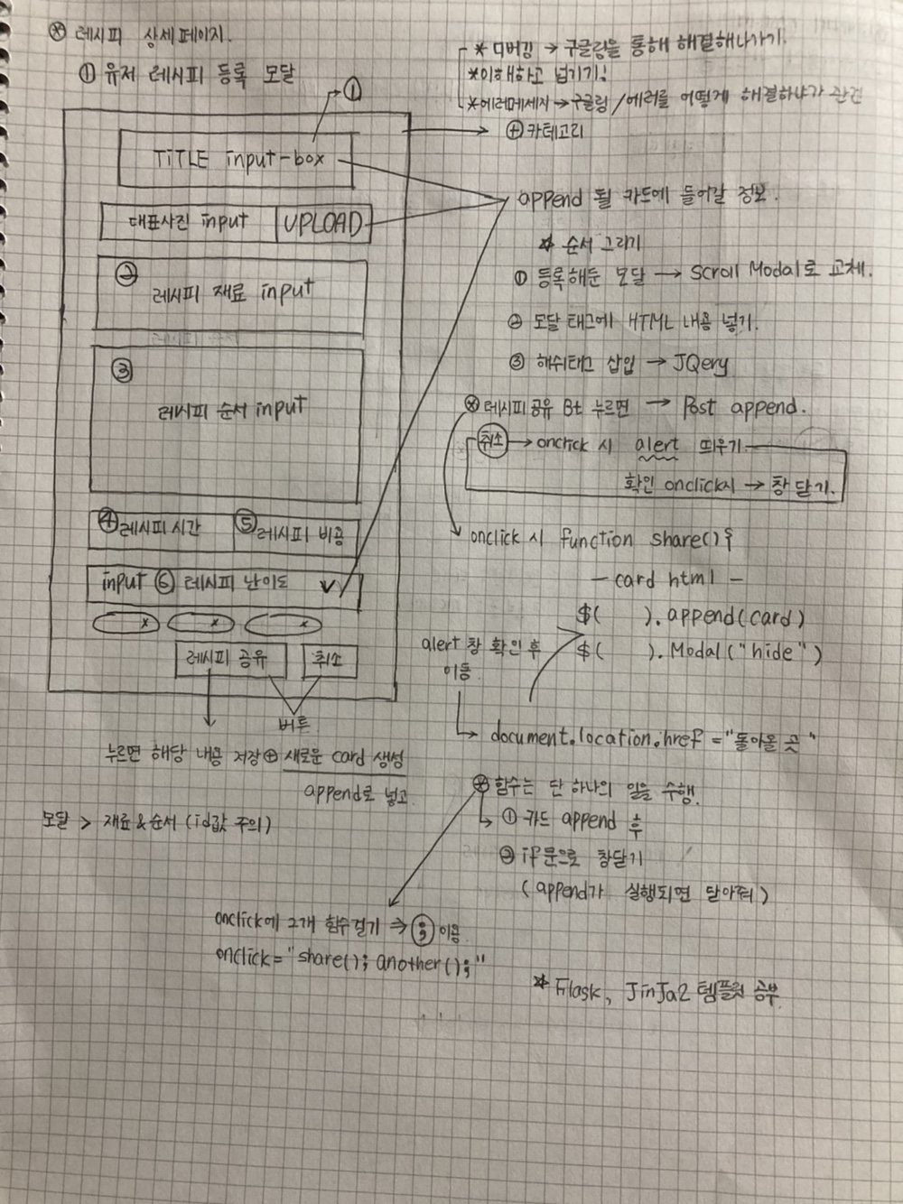 - 내가 Flask와 진자템플릿이 부족해서 팀원과 합의하에 내가 스크립트와 디자인요소를 담당하기로 했다. 그래서 팀원들한테 필요한 부분이나, 자투리들을 처리하기로 했다.