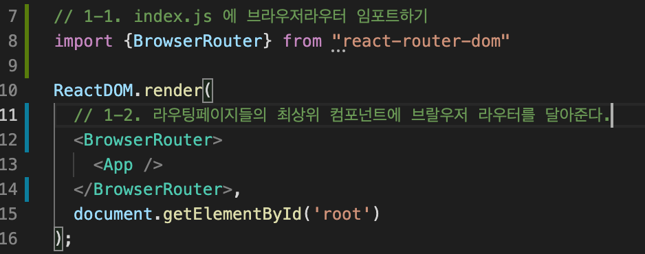 < 1 > 브라우저 라우터 임포트하고 적용하기 < 2,3 > App.js 에 라우트 임포트 해주고 라우팅 적용하기