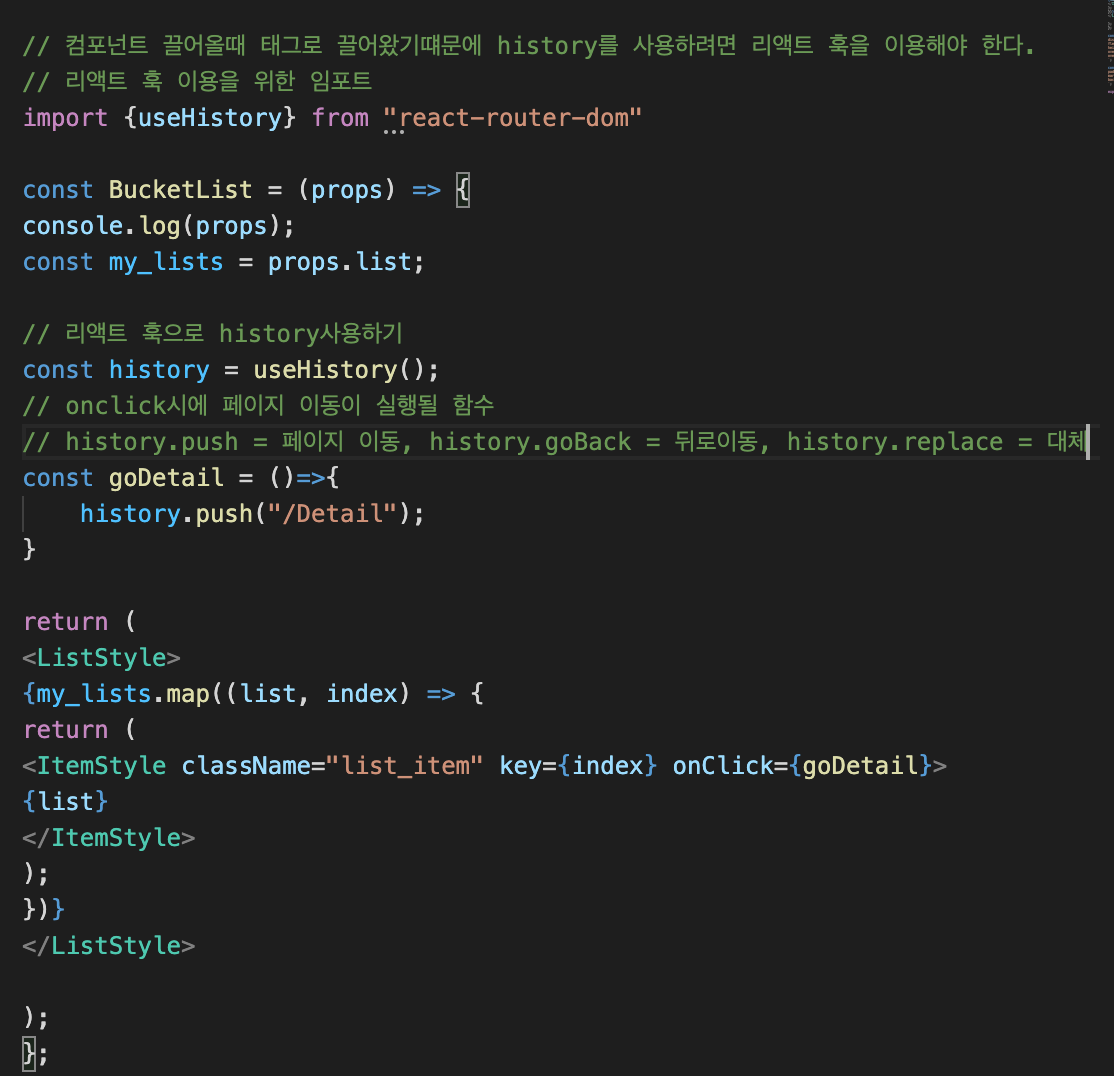 - history 이용 -> 히스토리를 이용 할 수 있는 여건이 갖춰져야 함(component={}를 이용하든지, 리액트 훅을 이용해야 한다.)