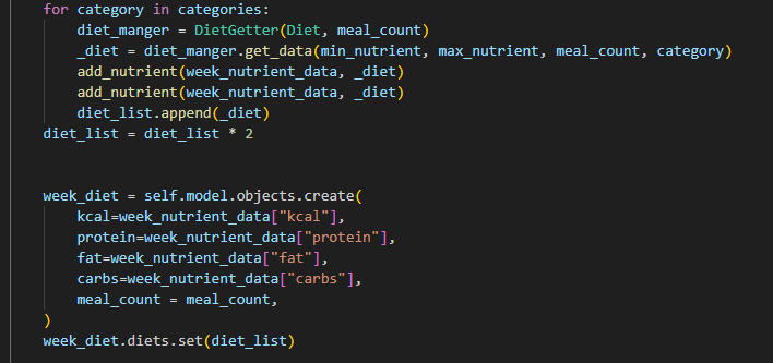 week_diet = self.find_instance(WeekDiet, week_min_nutrient, week_max_nutrient, meal_count, categories)
