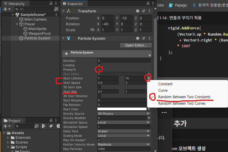 파티클이 생성될 때마다 설정된 최소값과 최대값 사이의 랜덤 값으로 설정