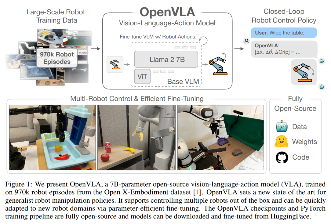 이 논문은 이러한 문제를 해결하기 위해 70억 개(7B)의 매개변수를 가지는 오픈소스 일반화 VLA 모델인 OpenVLA를 제안합니다. 이는 대규모의 Open X-Embodiment 데이터셋을 활용하여 기존 비공개 모델들을 능가하는 제어 성능을 확보함과 동시에, 일반적인 소비자용 GPU 환경에서도 효율적인 학습과 추론이 가능한 파이프라인을 구축하는 것을 핵심 목표로 합니다.