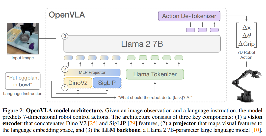 OpenVLA는 Prismatic-7B VLM을 백본으로 사용하며, 크게 세 가지 구조로 이루어져 있습니다.