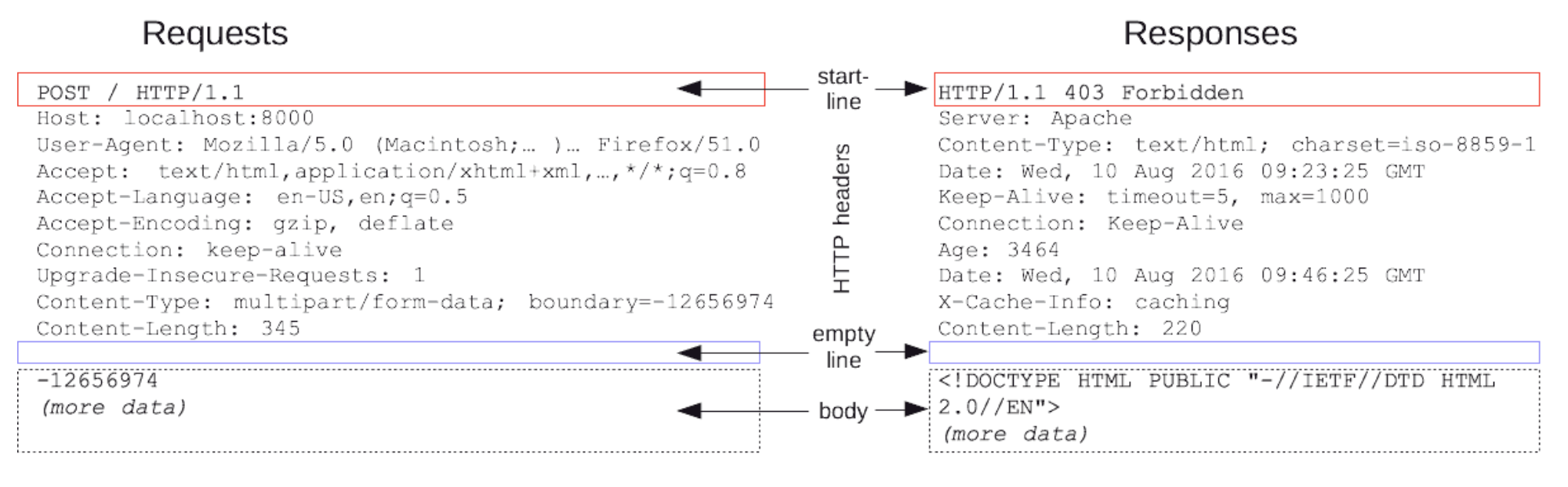 - 클라이언트에 의해 전송되는 메시지를 요청(requests)이라 하고, 요청에 대해 서버에서 응답으로 전송하는 메시지를 응답(responses)이라고 한다