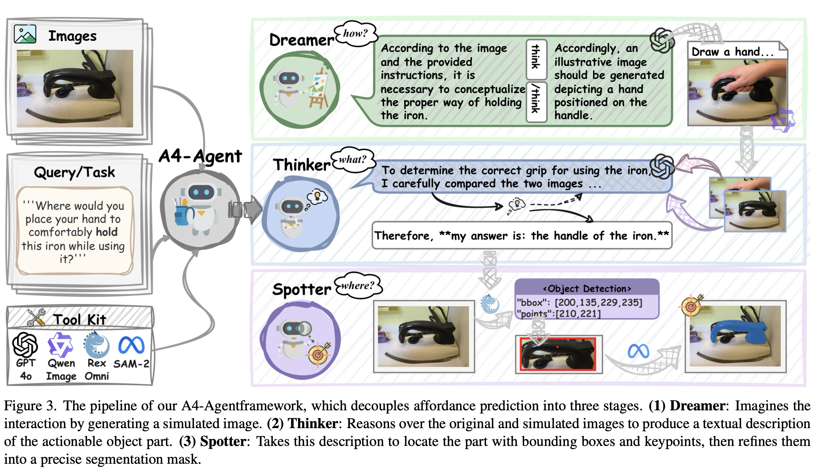 따라서, 본 연구는 근본적으로 다른 접근 방식을 탐구하는 것을 목표로 한다: 추론과 근거 제시를 전문화되고 조정된 에이전트로 분리하는 것이다. 우리는 어포던스 예측이 본질적으로 다단계적이라고 주장한다. 단일 모델이 두 가지 능력을 모두 습득하도록 강요하기보다는, 우리는 최첨단 기반 모델들을 사용하여 각 구성 요소를 독립적으로 설계하고, 테스트 시점에 에이전트 프레임워크를 통해 이들을 조직한다.