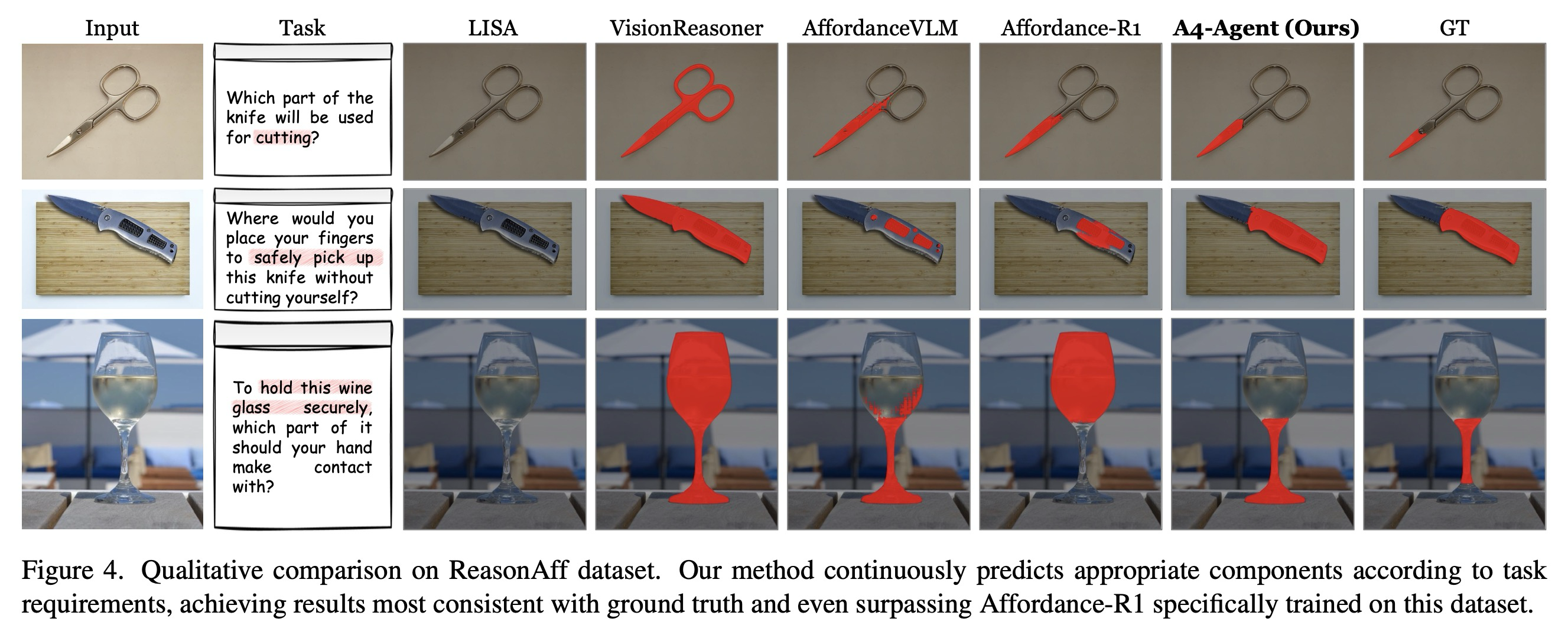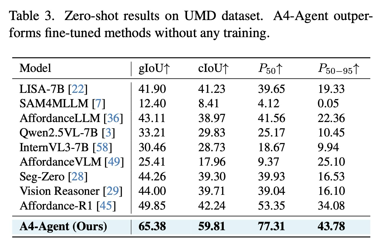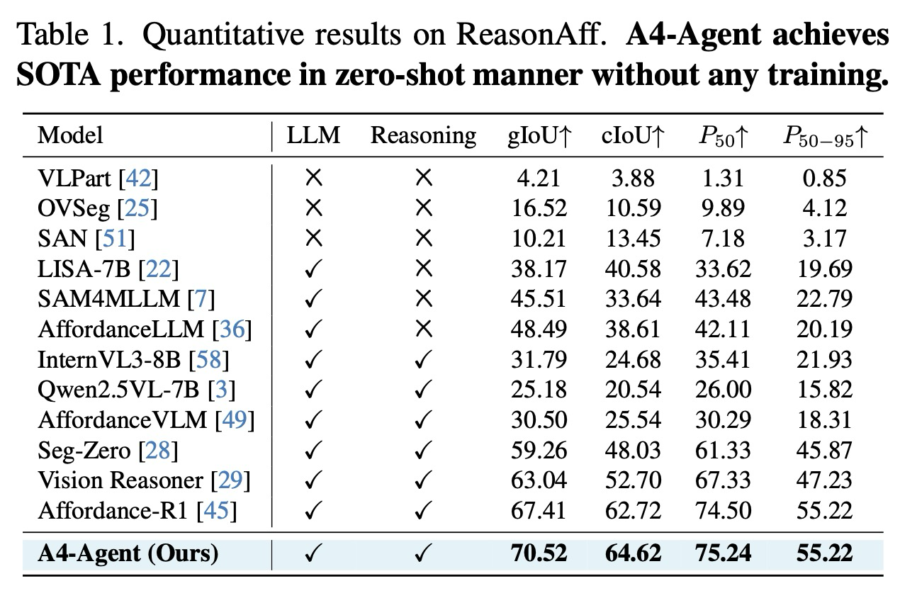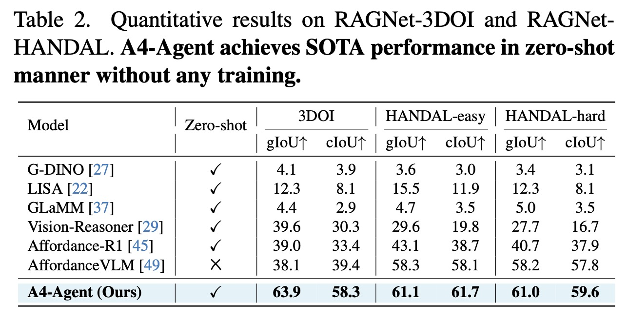 3. 훈련 없는 제로 샷 접근 방식인 A4-Agent는 복잡한 추론을 요구하는 벤치마크에서 기존의 지도 학습 방식들을 능가하는 최첨단 성능을 달성하며, 실제 개방형 세계 시나리오에서도 강력한 일반화 능력을 입증했다.