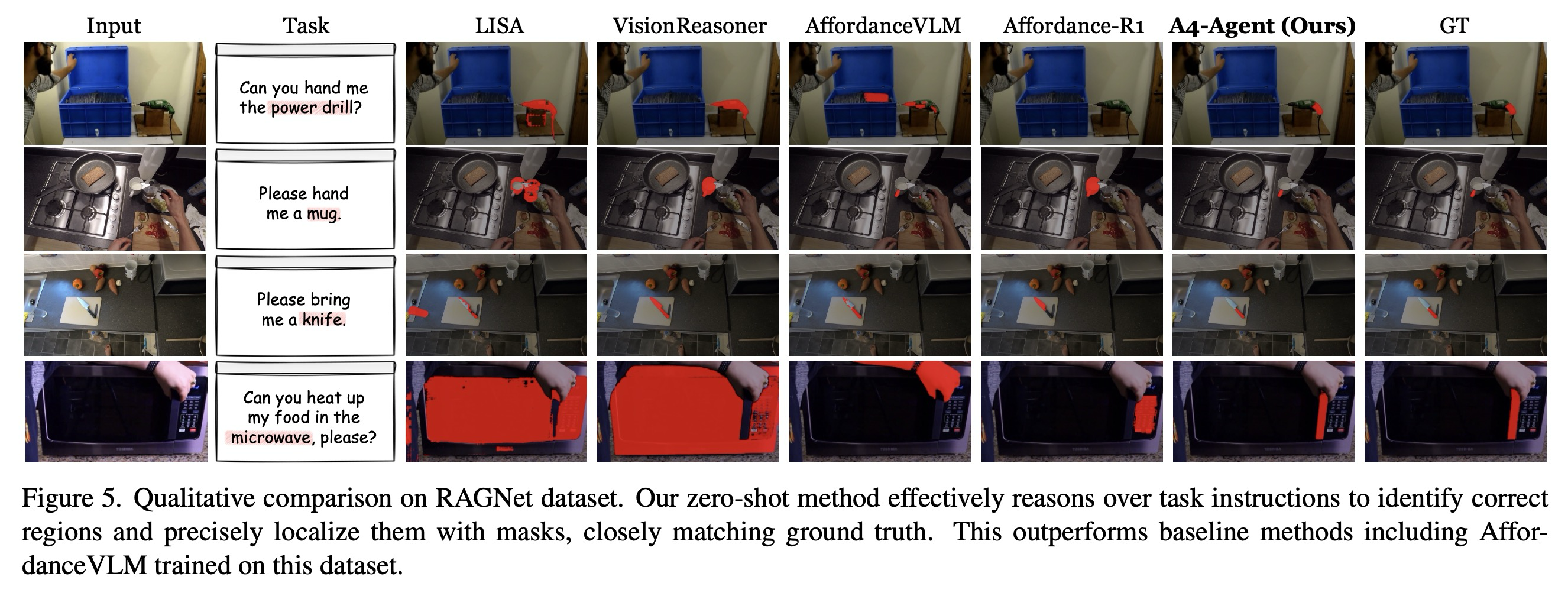 결정적으로, A4-Agent는 이 데이터셋으로 훈련된 지도 학습 AffordanceVLM을 능가하며, 기초 모델의 에이전트적 조정이 복잡한 추론 작업에 대한 작업별 미세 조정을 능가함을 입증한다. 이는 추상적인 지침을 실행 가능한 단계로 분해하고 시각적으로 정확하게 근거 제시하는 본 연구의 능력에서 비롯되며, 이는 분리된 아키텍처의 핵심 이점이다.