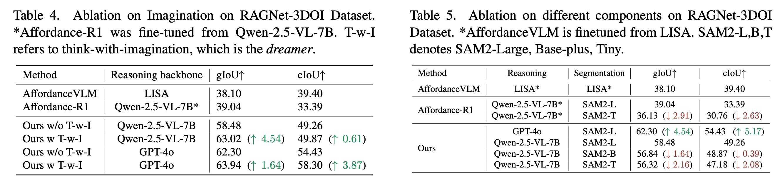 Segmentation Backbone. SAM2-Large를 더 작은 변형(SAM2-Base-Plus/Tiny)으로 대체하면 성능이 약간 떨어지지만, 이 프레임워크는 여전히 매우 효과적이며 기준선보다 훨씬 뛰어난 성능을 보인다. 성능 하락 폭 또한 기준선 방법인 Affordance-R1보다 작다. 이는 더 약한 근거 제시 구성 요소에도 불구하고 우리 접근 방식의 견고성을 강조한다.
