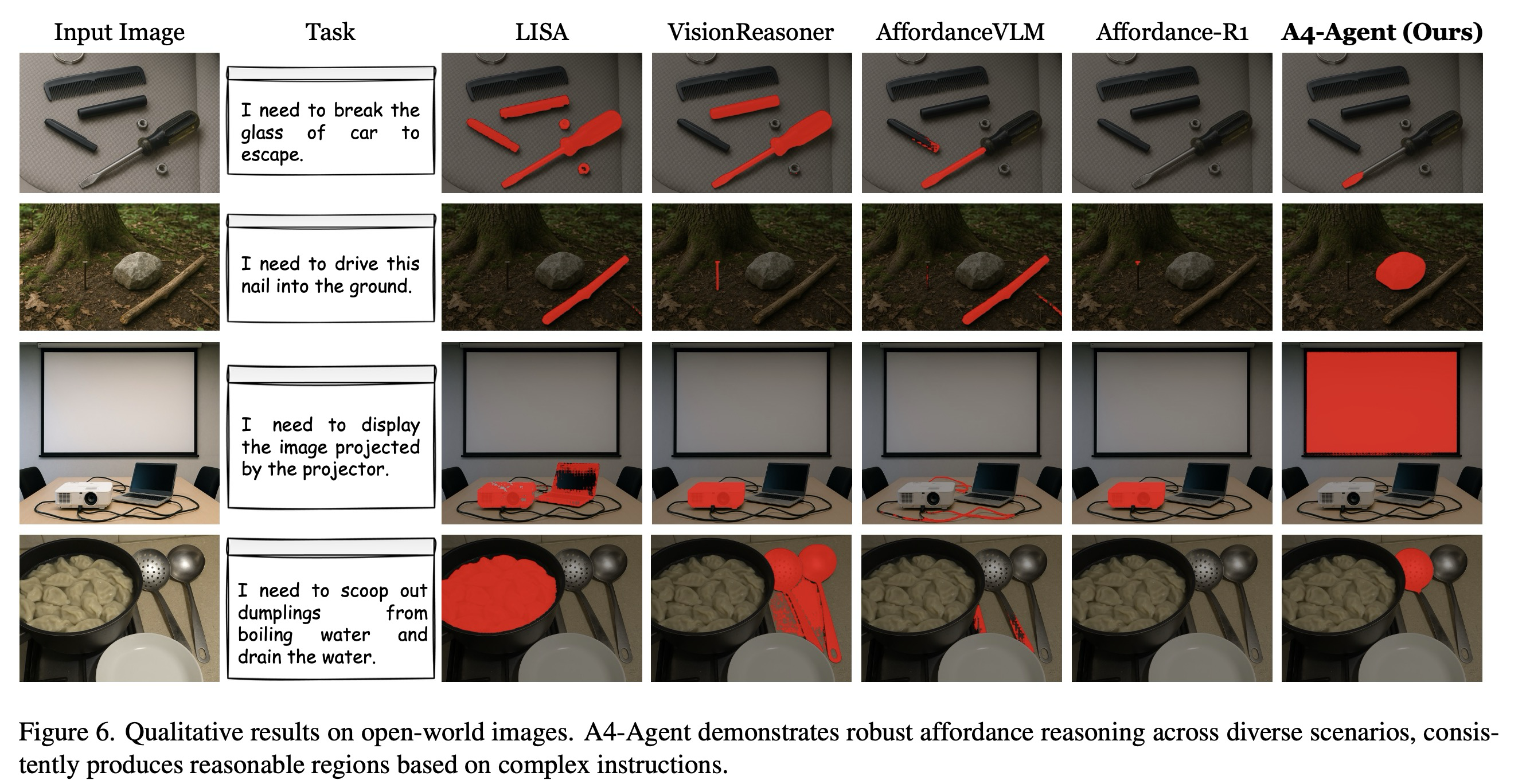 개방형 세계 시나리오에서 A4-Agent의 성능을 추가로 검증하기 위해, 우리는 개방형 세계 이미지에 대한 정성적 실험을 수행한다. 그림 6은 A4-Agent가 다음과 같은 어려운 시나리오 전반에 걸쳐 강력한 성능을 보여줌을 나타낸다: (1) 새로운 객체(Novel objects): 표준 벤치마크에는 없는 객체(예: 디지털 장비)에 대한 작동 가능한 영역을 성공적으로 식별한다. (2) 복잡한 장면(Complex scenes): 복잡한 환경에서 도구의 가장 적합한 부분(예: 스크루드라이버의 끝)을 정확하게 식별한다. (3) 심층 추론(Deep reasoning): 강력한 추론 능력을 사용하여 적절한 도구를 논리적으로 추론한다(예: 물을 빼는 데 사용할 수 있는 구멍 뚫린 숟가락, 못을 박는 망치 대용으로 사용할 수 있는 돌).
