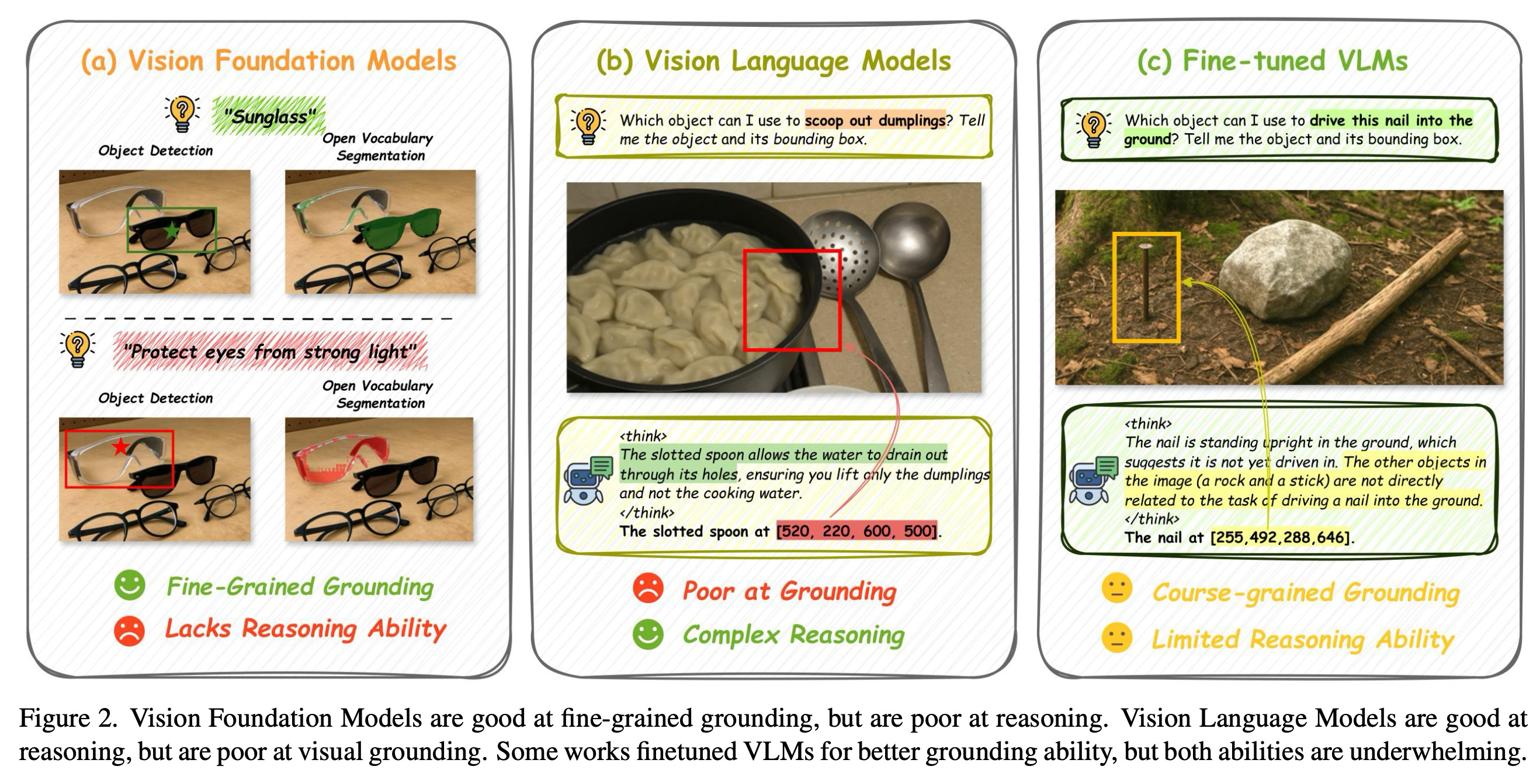 기존 패러다임은 단일의 엔드 투 엔드 모델을 통해 이러한 이분법을 해결하려고 시도한다. 이러한 접근 방식은 시각적 근거 제시 데이터(예: 경계 상자, 핵심점, 마스크)를 통해 MLLM을 훈련하여 추론 모델의 근거 제시 능력을 향상시키려고 노력한다. 그러나 그림 2 (c)가 보여주듯이, 이러한 긴밀하게 결합된 패러다임은 이상적이지 않다. 여전히 근본적인 한계를 내포한다. (1) 제한된 일반화: 제한된 데이터셋으로 훈련하는 것은 실제 시나리오의 다양성을 포괄할 수 없으며, 새로운 객체와 환경에 대해 취약하게 만든다. (2) 능력 상충 관계: 추론과 근거 제시를 동시에 최적화하는 것은 모델이 서로 다른 목표 사이에서 균형을 맞추도록 강제하며, 한 능력의 개선이 다른 능력의 저하를 초래할 수 있다. (3) 낮은 유연성: 단일 통합 설계는 더 강력한 기반 모델이 등장할 때 독립적인 업그레이드를 방해하며, 전체 시스템에 대한 비용이 많이 드는 재훈련을 요구한다. (4) 폐쇄형 모델과의 격차: 이러한 파이프라인은 오픈 소스 체크포인트에 국한되므로, 가장 유능한 폐쇄형 모델을 활용할 수 없어 추론 능력의 상한선을 제한한다.