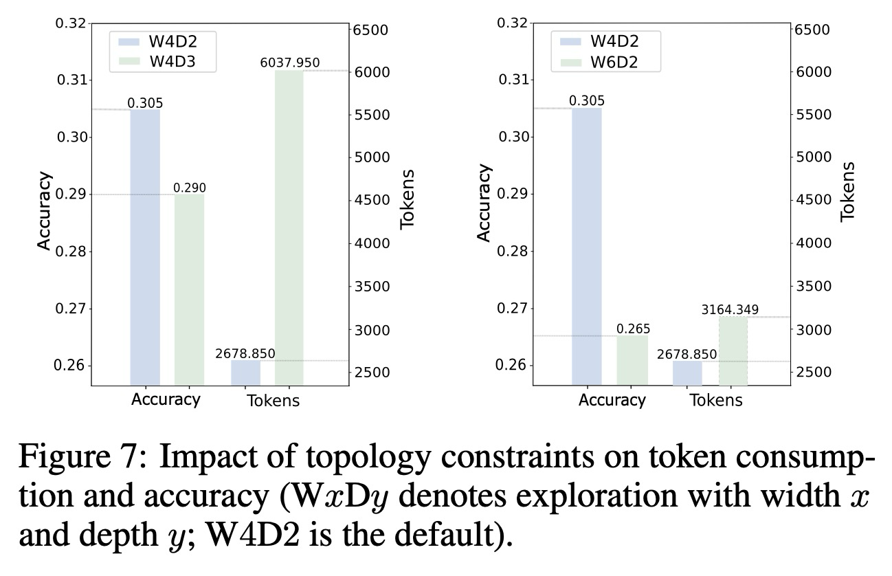 보상 조형(reward shaping)이 효율성 제어를 위한 직접적인 메커니즘을 제공하지만, 협업 구조 자체 또한 매우 중요한다. 오케스트레이터가 에이전트 협업을 조직할 때, 토폴로지에 대한 상한 제약 조건—구체적으로 체인 깊이(chain depth)와 탐색 너비(exploration width)—는 무한한 확장과 비효율성을 방지하는 데 필수적이다. 깊이는 오케스트레이션된 에이전트 체인의 길이를 의미하는 반면, 너비는 병렬 탐색의 수를 포착한다. 그림 7에서 보듯이, 명확한 비단조적 관계가 존재한다. 즉, 기본 설정이 우리의 목적에 가장 적합한 트레이드오프를 달성하는 반면, 깊이나 너비를 증가시키면 중복성, 더 높은 계산 비용, 그리고 성능 저하 가능성으로 이어진다. 일반적으로 정확도를 높이면 토큰 소비가 증가하는 경향이 있으며, 그 반대도 마찬가지이다. 이는 깊이와 너비를 신중하게 균형 있게 맞추는 것이 효율성과 효과성 모두를 유지하는 데 도움이 될 수 있음을 시사한다.