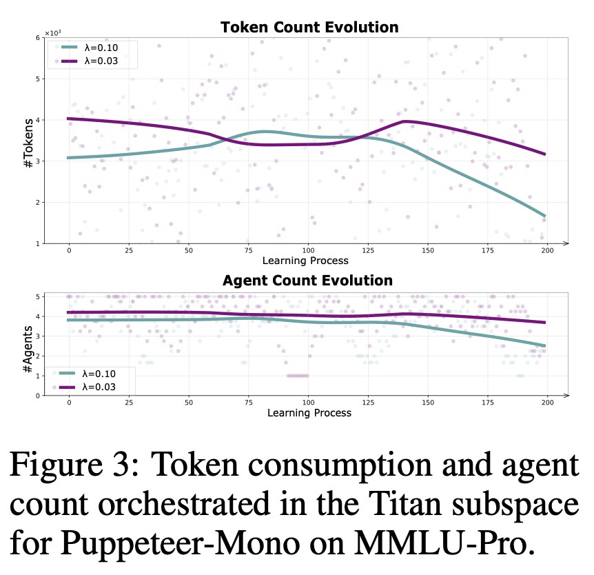 실제적으로, 이것은 에이전트의 동적 가지치기를 촉진한다: 오케스트레이션 프로세스는 증분적 이득이 거의 없거나 과도한 비용을 발생시키는 에이전트에 대한 의존도를 줄여서 점점 더 간결한 추론 체인을 선호하도록 적응한다. 시간이 지남에 따라, 오케스트레이터 정책은 더 효과적인 에이전트 시퀀스를 조직하도록 진화하며, 표현력이 풍부한 협업과 계산 효율성 사이의 균형을 맞춘다. 따라서, 진화 가능한 꼭두각시 조종자는 에이전트 협업을 오케스트레이션할 뿐만 아니라, 추론 프로세스를 가장 필수적인 구성 요소로 증류(distill)하여 견고하고 확장 가능한 성능을 가능하게 한다.