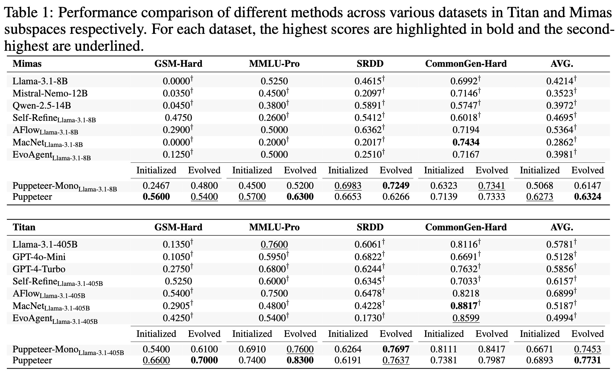 효과적인 MAS를 조직하는 Puppeteer의 능력을 보여주기 위해, 우리는 초기 단계와 진화된 단계 사이의 성능을 비교한다. 그 결과는 지속적인 최적화가 상당한 이득을 산출함을 보여준다—예를 들어, Titan 서브스페이스의 Puppeteer는 평균적으로 0.6893에서 0.7731로 향상되며, Mimas 서브스페이스에서도 유사한 경향이 관찰된다. 이러한 발견들은 조정 및 태스크 전문화를 향상시키는 데 있어 지속적인 최적화의 중요한 역할을 강조하며, 전통적이고 정적인 에이전트 패러다임을 넘어 보다 적응적이고 협력적인 에이전트 시스템으로 나아가는 유망한 방향을 제시한다.