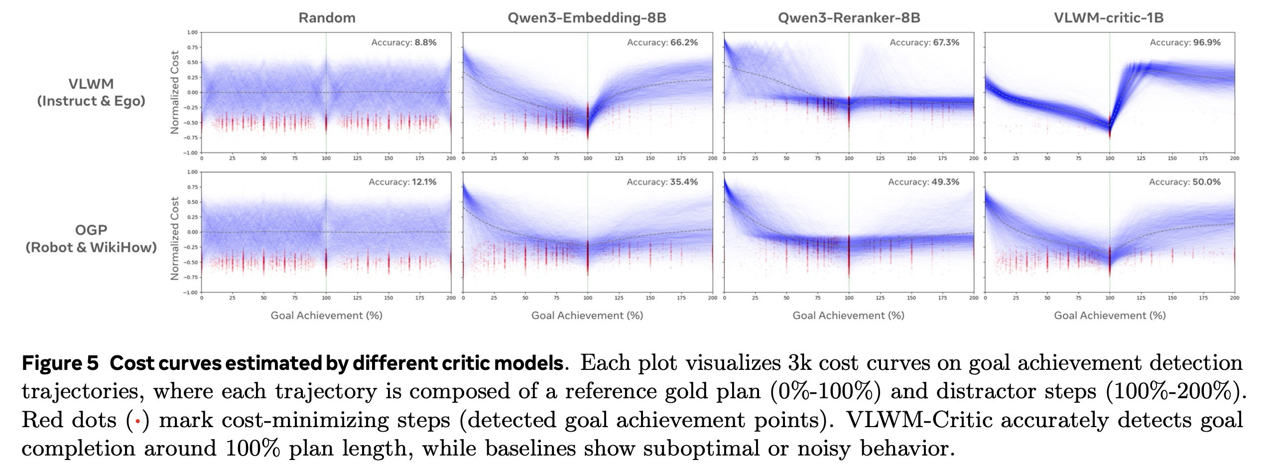 그림 5에서 우리는 다양한 비평가 모델이 예측한 정규화된 비용 곡선을 시각화한다. 이 시각화는 "에너지 지형(energy landscape)"으로 볼 수 있으며, 원하는 형태는 100% 목표 달성 지점에서 최소 비용을 갖는 것이다. VLWM 데이터에서 VLWM-critic-1B는 기준선에 비해 훨씬 더 깨끗한 지형을 제공한다. 그러나 OGP 데이터셋에 대해서는 분포가 더 노이즈가 많아진다. 위에서 언급된 도메인 차이 및 데이터셋 노이즈 문제 외에도, 성능 저하의 한 가지 잠재적 이유는 OGP가 명시적인 월드 상태 설명 없이 행동만 포함하는 궤적을 제공하여 비용 평가를 더 어렵게 만들기 때문이다.