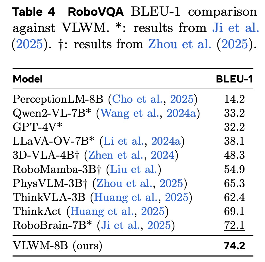 VLWM의 접지된(grounded) 고수준 추론 및 계획 능력을 더욱 평가하기 위해, 우리는 RoboVQA 벤치마크에서 이를 평가한다. RoboVQA는 모델이 현실적인 다중 구현체(multi-embodiment) 환경에서 로봇 중심의 시각 질문 응답을 수행하도록 요구하며, 복잡한 시각 장면의 이해와 일관된 행동 시퀀스의 실행을 필요로 한다. 이 벤치마크는 VLWM이 로봇 에이전트를 효과적으로 안내하는 능력을 테스트함으로써 절차적 계획 평가를 보완한다. 우리는 RoboVQA의 표준 평가 프로토콜을 따르며 BLEU 점수를 사용하여 VLWM의 성능을 비교한다. 우리는 우리의 모델을 최첨단 로봇 LLM들인 3D-VLA-4B, RoboMamba-3B, PhysVLM-3B, RoboBrain-7B, ThinkVLA-3B, 그리고 ThinkAct과 비교한다.