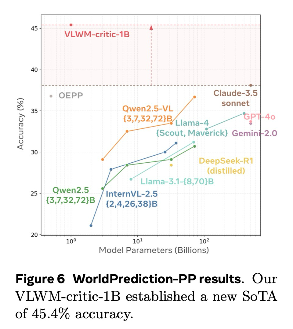 WorldPrediction-PP에서 우리의 비평가 모듈을 평가하기 위해, 우리는 Chen et al. (2025)의 소크라테스 LLM에 대한 평가 프로토콜을 따랐다. 시각적 입력은 먼저 Qwen2.5-VL에 의해 생성된 캡션을 사용하여 텍스트 설명으로 변환되었다. 구체적으로, 초기 및 최종 상태를 묘사하는 두 이미지는 월드 상태의 변화를 간략하게 설명하는 목표 설명을 생성했으며, 후보 행동의 동영상 클립 또한 유사하게 캡션 처리되었다. 이러한 텍스트 입력은 우리의 VLWM-비평가 모델에 직접 제공되어 각 후보 계획에 대한 비용을 계산하고, 예측된 비용이 가장 낮은 옵션을 선택했다. 그림 6 (b)에서 우리는 우리의 VLWM-비평가 모델을 기준선 소크라테스 LLM과 비교한다. 우리의 모델은 모델 크기와 정확도 사이에서 파레토 최적의 균형을 달성한다. 중요하게도, 이 평가는 VLWM-비평가 모델에게 제로 샷(zero-shot) 시나리오를 구성한다. 이는 캡션 기반의 목표 설명이나 상세한 동영상 캡션 기반의 행동 단계 모두 훈련 코퍼스의 일부가 아니었기 때문이다. 우리의 VLWM-critic-1B는 45.4%의 정확도로 새로운 최첨단 성능(SoTA)을 확립했다.