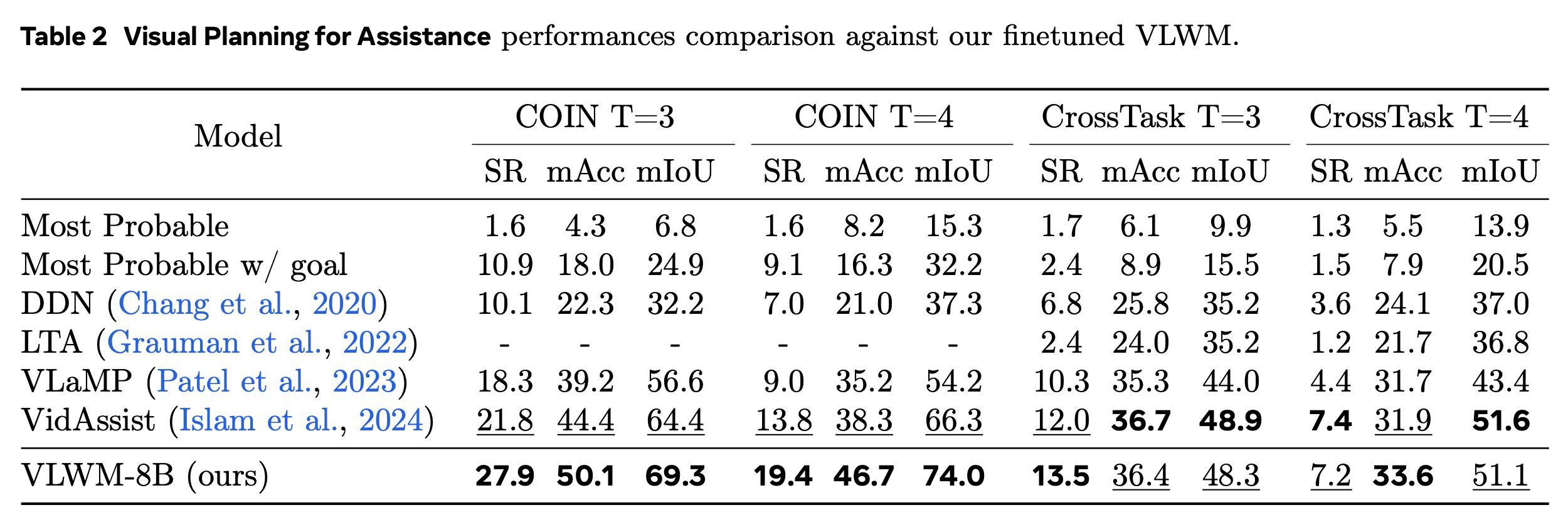 표 2는 VLWM이 VPA 벤치마크에서 새로운 최첨단 성능을 설정함을 확인한다. COIN과 CrossTask 모두에서, 그리고 과 두 수평선 모두에서, 우리 모델은 기존 기준선을 일관되게 능가한다. 70B LLM을 채택한 VidAssist와 비교했을 때, 우리의 VLWM은 훨씬 작지만(8B) 12개의 메트릭 중 8개에서 우수한 결과를 달성한다. 네 가지 설정 전체에서 평균적으로, VLWM은 SR에서 +3.2%, mAcc에서 +3.9%, mIoU에서 +2.9% 포인트의 절대적인 이득을 제공한다.