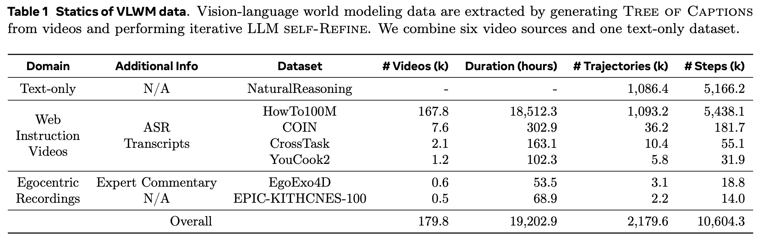 Sources of Videos. 표 1에 요약된 바와 같이, 시각-언어 월드 모델링을 위한 훈련 동영상은 두 가지 주요 도메인에서 가져온다: 1) 웹 교육 동영상: COIN, CrossTask, YouCook2, 그리고 HowTo100M 동영상의 일부이다. 이 동영상들은 다양한 범위의 과제를 다루며 깨끗한 전문가 시연을 제공한다. 2) 1인칭 녹화물 (Egocentric recordings): EPIC-KITCHENS-100 및 EgoExo4D이다. 이 동영상들은 현실적인 웨어러블 에이전트 시나리오에서 연속적이고 편집되지 않은 녹화물을 특징으로 한다. 모든 데이터셋에 대해, 우리는 해당 훈련 분할(training split)에서 동영상을 수집한다. 대규모 1인칭 녹화물 데이터셋으로 Ego4D가 사용 가능하지만, 우리는 훈련 데이터에서 이를 제외했는데, 이는 일관성 없는 훈련/검증 분할로 인해 벤치마크와의 잠재적인 중복을 피하기 위함이다.