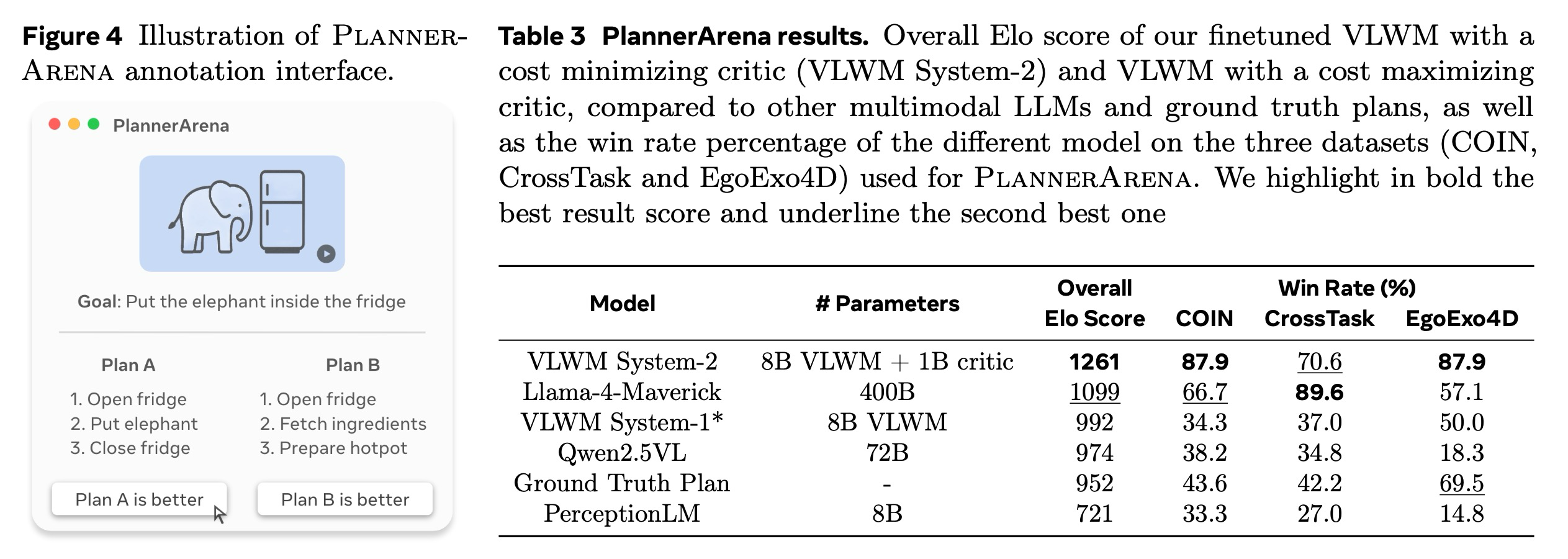 우리의 실험 설정은 세 가지 데이터셋(COIN, CrossTask, EgoExo4D)을 포함하며, 여기서 우리는 VLWM 시스템-2(생성된 계획의 비용을 최소화하는 8B 비평가에 의해 탐색되는 20개 계획에 대한 탐색과 함께)와 비용을 최대화하는 8B 비평가를 사용하는 VLWM을 선도적인 다중 모드 LLM 및 정답 계획과 비교한다. 쌍들은 균형 잡힌 수의 대결을 위해 가능한 모든 대결 구성에 걸쳐 균일하게 샘플링된다,. 모델들은 초기 점수 1000점에서 시작하며, 각 대결 후 점수 업데이트를 위해 Elo K-인수(K-factor) 32를 사용한다. 총 5명의 주석가(annotator)가 PlannerArena 평가에 참여하여 총 550쌍의 대결을 평가했으며, 3명의 주석가는 주석가 간 일치도 점수를 계산하기 위해 90개의 샘플로 구성된 고정된 파일럿 실행을 수행했다,. PlannerArena에 대한 추가 세부 정보는 부록에서 찾을 수 있다.