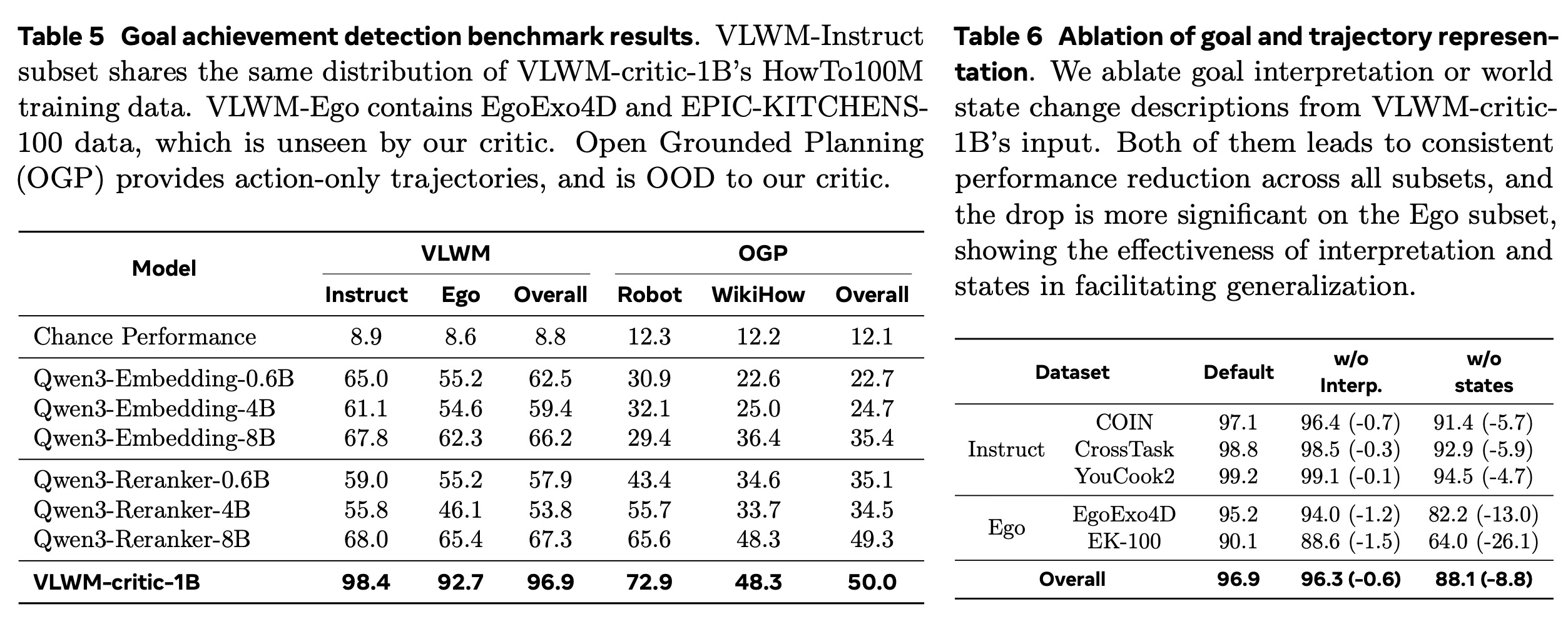 Main Results. 우리는 VLWM-critic-1B를 의미론적 유사성을 측정하기 위한 최첨단 모델인 Qwen3-Embedding 모델 및 Qwen3-Reranker 모델(Zhang et al., 2025)과 기준선으로 비교한다. 비용은 로 계산된다. 결과는 표 5에 나와 있으며, 우리의 VLWM-critic-1B는 대부분의 하위 집합에서 기준선을 큰 차이로 능가한다. VLWM-critic-1B는 VLWM-Instruct에서 98.4%를 달성한 반면, VLWM-Ego에서는 92.7%로 더 낮다. 이는 도메인 차이로 인해 발생했을 가능성이 있는데, 우리의 비평가는 1인칭 녹화 데이터는 전혀 보지 않고 HowTo100M 지시 동영상으로만 훈련되었기 때문이다. OGP에서 우리의 비평가는 최고의 기준선인 Qwen3-Reranker-8B에 비해 뚜렷한 우위를 보이지만(72.9% 대 65.6%), OGP-WikiHow에서는 비교 가능한 성능을 보인다(매개변수가 8배 더 적음에도 불구하고). 이러한 작은 격차의 가능한 이유는 데이터 노이즈 또는 Qwen3-Reranker의 훈련 데이터와의 잠재적 중복을 포함한다.