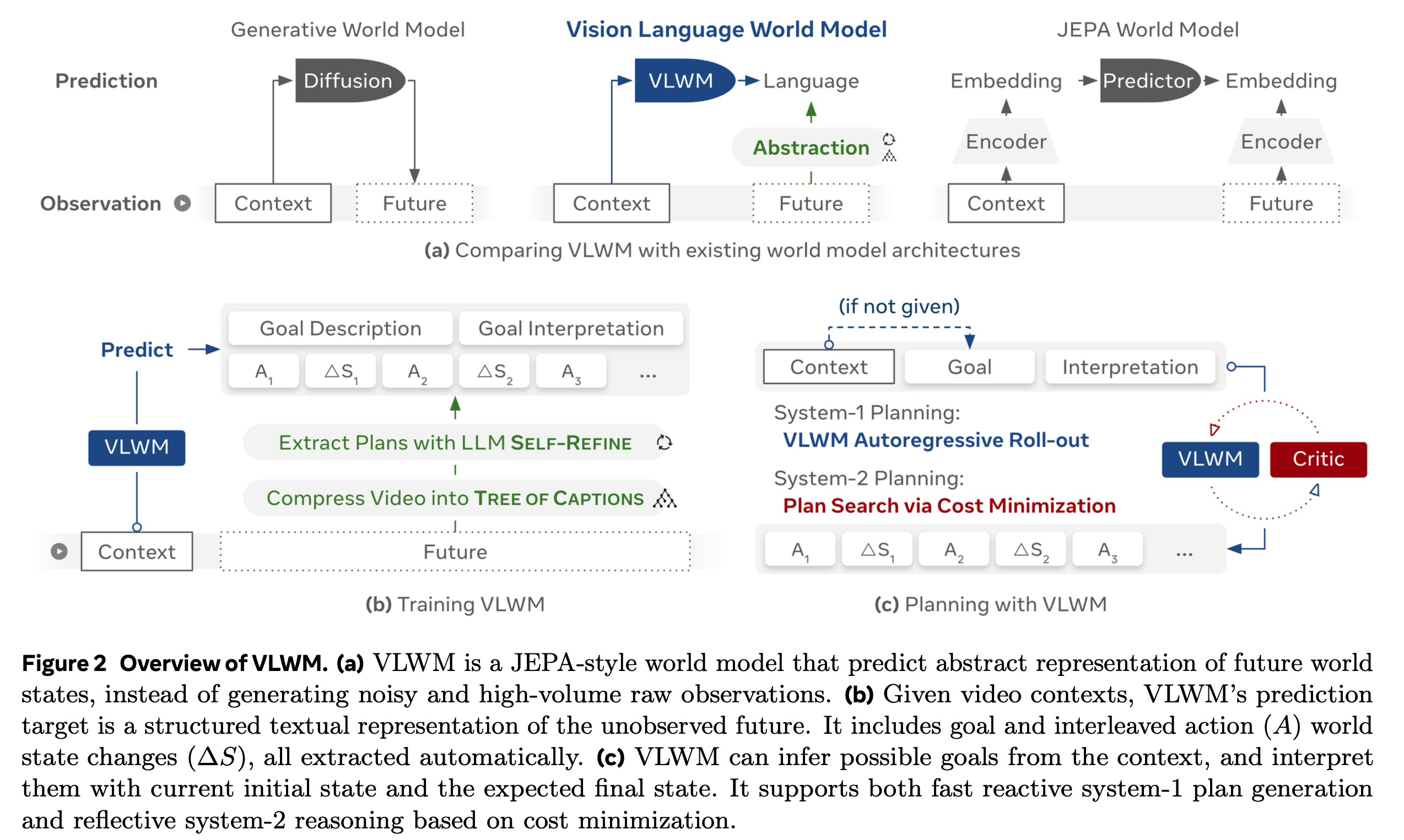 1. VLWM (Vision Language World Model)은 자연어 기반의 추상적 월드 상태 표현을 활용하여, 대규모 원본 동영상 데이터로부터 환경 동역학(dynamics)을 직접 예측하도록 학습된 파운데이션 모델이다.