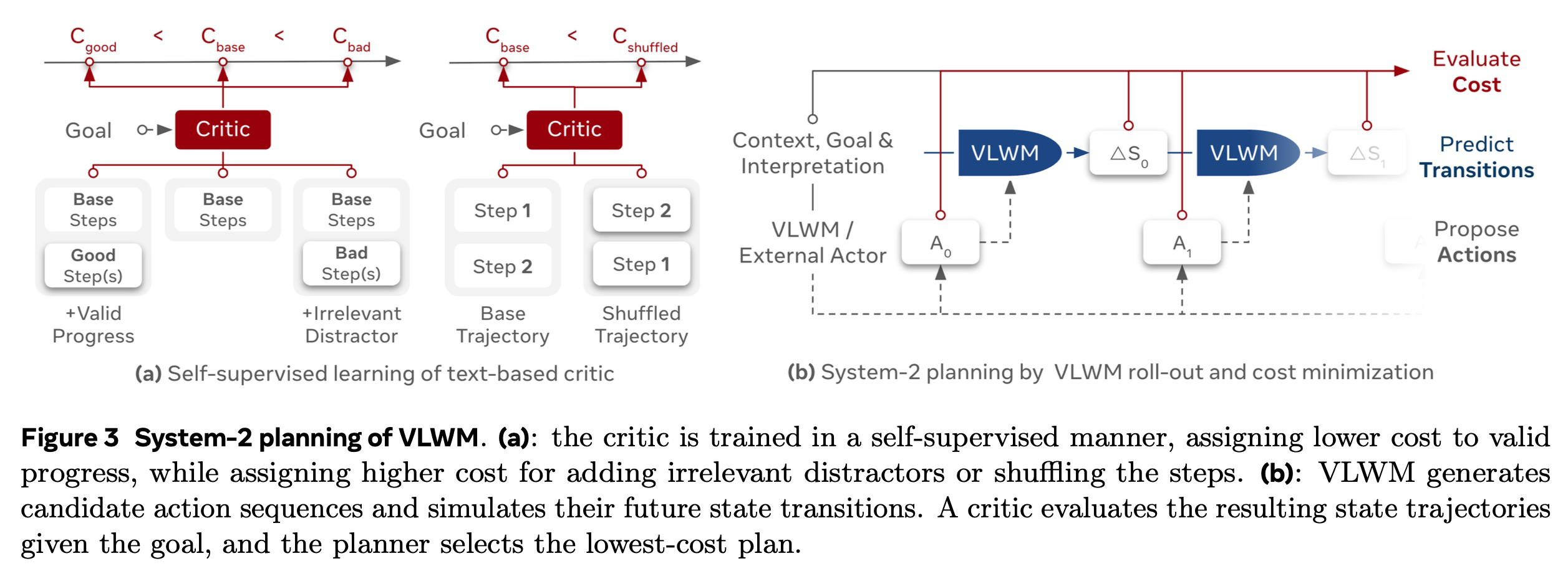 시스템-2 계획 수립은 VLWM, 비평가(critic), 그리고 행위자(actor)라는 세 가지 구성 요소의 조정을 포함한다. 그림 3(b)에 나타난 바와 같이, 행위자는 후보 행동 시퀀스를 제안하고, VLWM은 그 효과를 시뮬레이션하며, 비평가는 그 비용을 평가한다. 최종 계획은 예측된 비용이 가장 낮은 후보 시퀀스를 식별함으로써 선택된다.