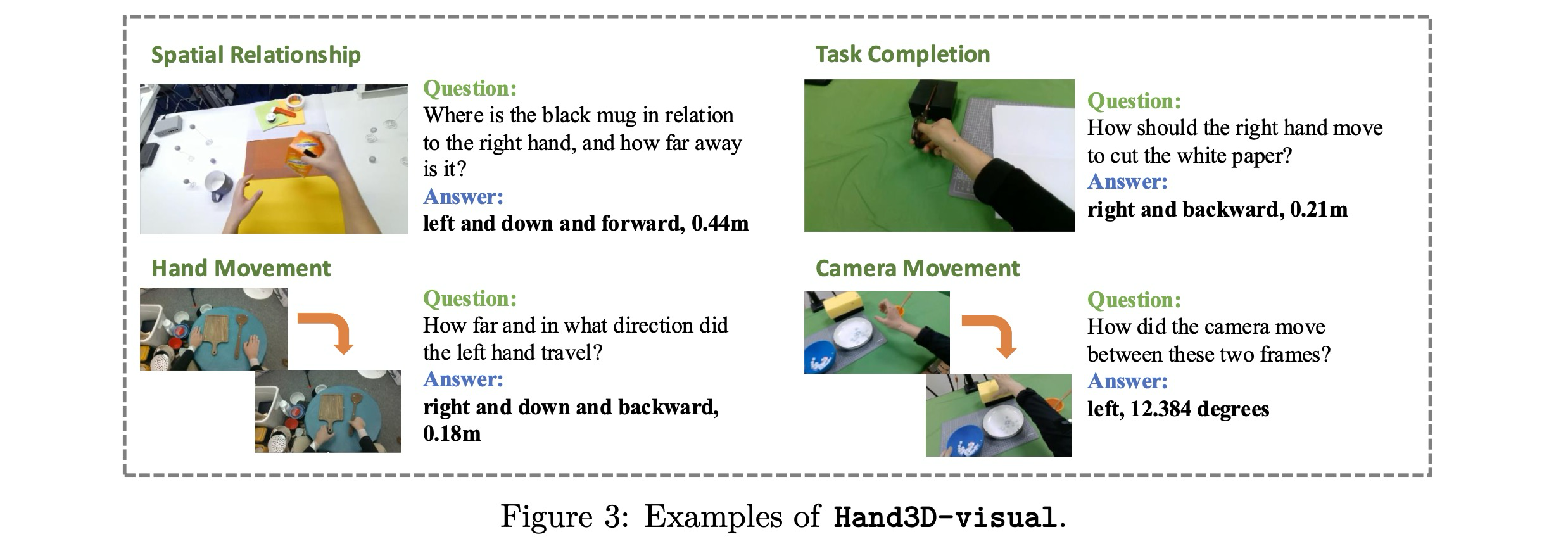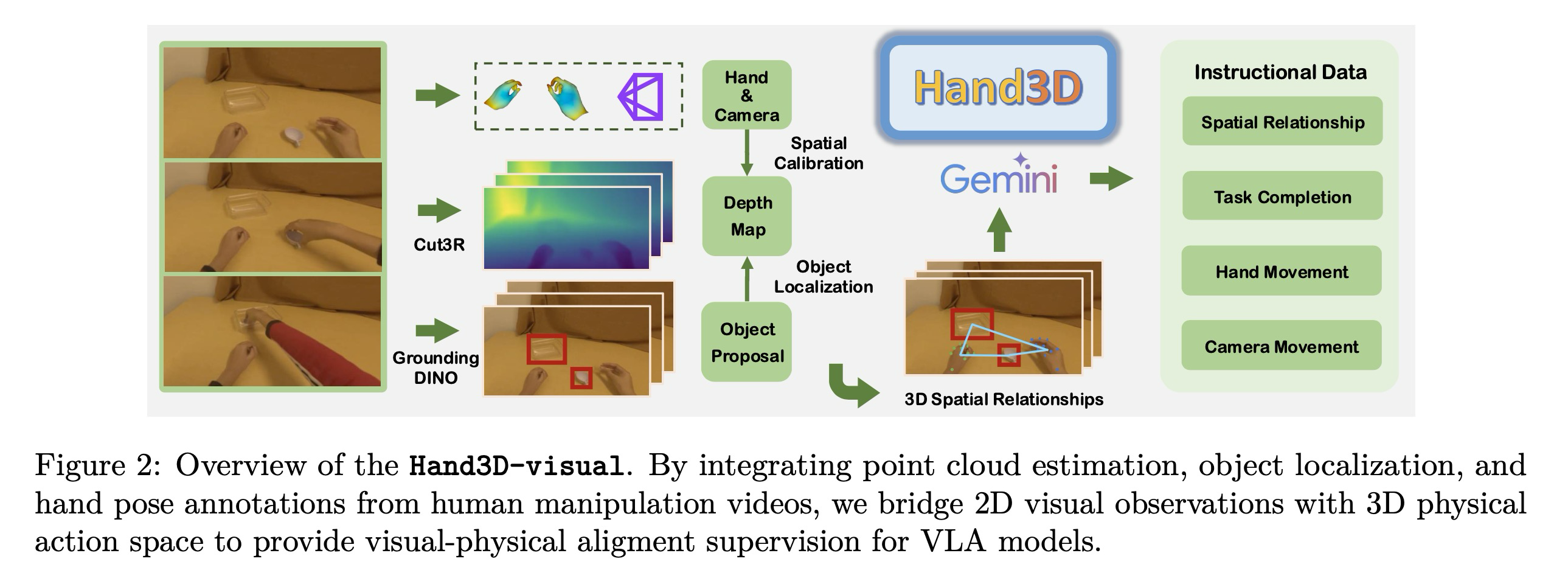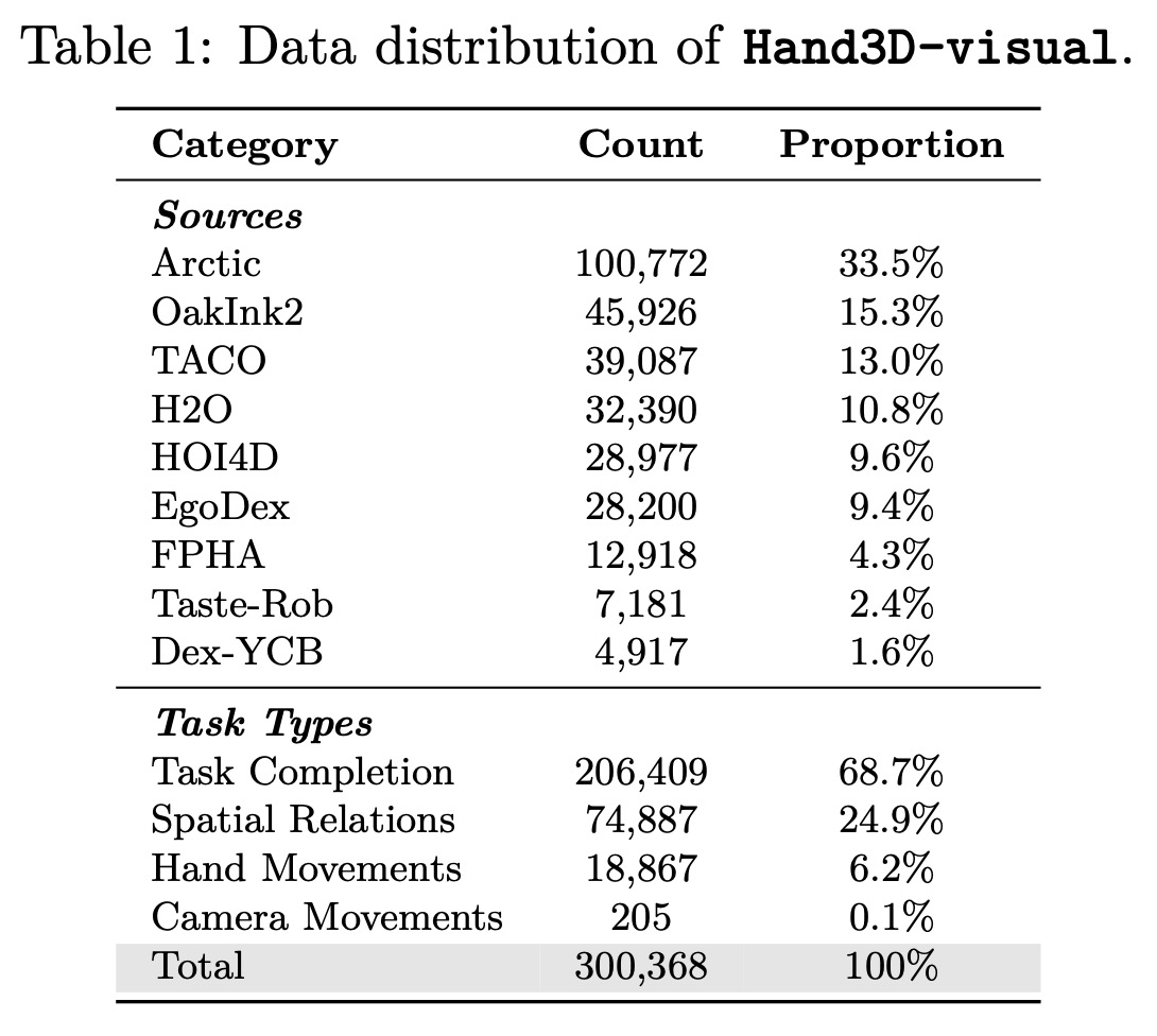 이 과정을 통해 조밀한 3차원 기하학 정보가 물리적으로 접지된 행동과 인간의 시각 시연을 연결하는 콤팩트하고 언어적으로 접지된 레이블로 변환된다. 이러한 공식화는 모델이 공간 구성을 인식할 뿐만 아니라 손 동작, 작업 지향 조작, 나아가 카메라 움직임과 같은 역동적인 변화에 대해 추론할 수 있게 하여 2차원 시각 관측과 3차원 행동 정책 사이의 가교를 강화한다. 9개의 이질적인 인간 조작 영상 소스로부터 대규모 인간 데이터를 활용하여 주석 작성을 위해 약 4,000개의 클립을 균등하게 샘플링했으며, 본 연구의 파이프라인을 통해 약 30만 개의 지침-응답 쌍을 생성하여 이를 Hand3D-visual이라 명명한다.