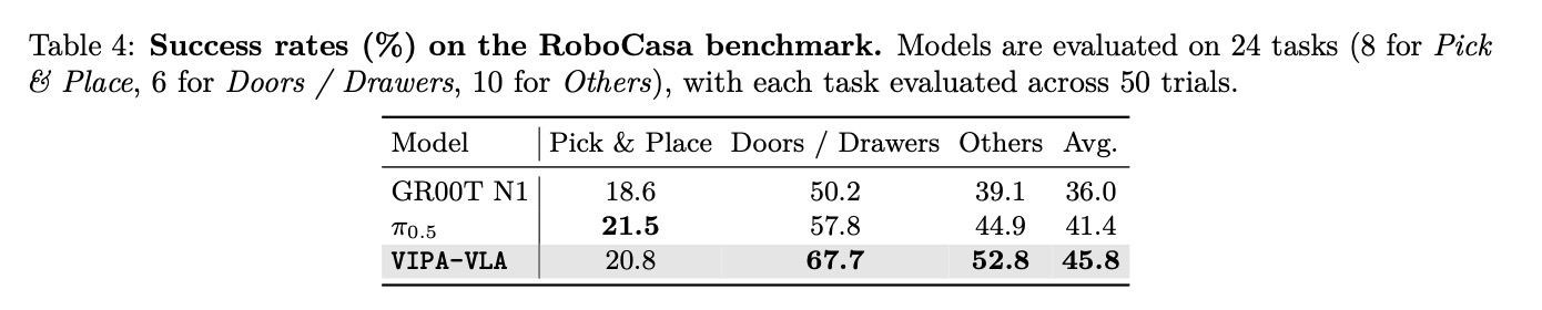 Results on RoboCasa. RoboCasa 실험에서는 3중 뷰 입력 구성을 채택하고 작업당 단 50개의 인간 시연만을 사용하여 VIPA-VLA를 훈련한다. Table 4에서 볼 수 있듯이, 다양한 RoboCasa 작업에 걸쳐 VIPA-VLA는 가장 우수한 전체 성능을 기록하며 멀티 뷰 관측 및 제한된 시연 데이터 하에서도 강력한 일반화 능력을 보여준다. 특히 정밀한 공간 로컬라이제이션이 필요한 Doors/Drawers 범주에서 상당한 개선(+9.9%)을 달성한다. 이러한 결과는 공간 인식 사전 학습이 모델에 더 신뢰할 수 있는 2차원-3차원 접지 능력을 부여하여, 기하학적으로 도전적인 환경에서도 정확한 공간 추론을 가능하게 함을 강조한다.