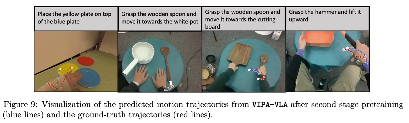 이어서 3차원 행동 주석에 대한 2단계 사전 학습의 정성적 결과를 Figure 9에 나타낸다. 예측된 궤적은 지침(instructions)과 밀접하게 일치하며, 이는 모델이 시각적 관측과 물리적 공간 사이의 매핑을 효과적으로 이해하고 있음을 보여준다. 인간의 자연스러운 가변성으로 인해 종종 노이즈가 있고 중복된 동작을 보이는 정답(ground-truth) 궤적과 비교할 때, 본 모델은 더 매끄럽고 목표 지향적인 궤적을 생성한다. 또한 예측 결과에는 학습된 어포던스(affordance) 지식이 반영되어 있다. 예를 들어, 나무 숟가락을 조작할 때 모델은 손잡이 끝부분 근처를 잡는다.