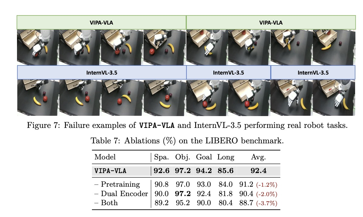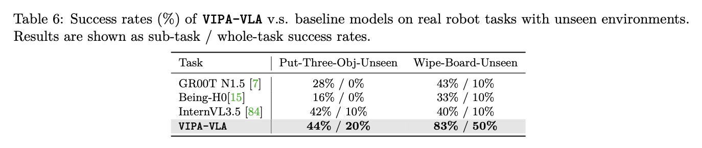 Table 5에서 보듯, VIPA-VLA는 모든 실제 조작 작업에서 최고의 종합 성능을 달성하며, 사전 학습 중에 습득한 공간 이해가 실제 로봇 조작을 효과적으로 도와 실제 환경에서 더 견고하고 일반화된 행동을 이끌어냄을 보여준다. 절제 실험(ablation) 베이스라인인 InternVL3.5와 비교했을 때, 본 모델은 모든 작업에서 상당한 개선을 이루어 제안된 공간 인식 사전 학습과 이중 인코더 아키텍처가 공간 접지 및 일반화 향상에 효과적임을 확인시켜 준다. VIPA-VLA가 Put-Three-Obj에서 전체 작업 성공률은 더 낮을지라도 하위 작업 성공률은 더 높게 나타나는데, 이는 베이스라인 모델들이 시퀀스 초기에 실패하여 첫 단계조차 완료하지 못하는 경우가 많아 공간 추론 및 제어가 덜 안정적임을 나타내기 때문이다. 대조적으로 VIPA-VLA는 작업 단계 전반에 걸쳐 더 일관된 진행을 보이며 실제 실행에서의 더 강한 견고함을 반영한다.