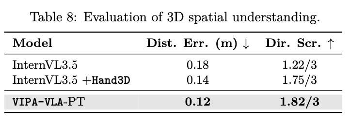 Effect of Spatial-Aware VLA Pretraining. 먼저 3차원 시각 주석에 대한 1단계 사전 학습이 공간 이해 능력을 향상시키는 데 미치는 효과를 평가한다. 구체적으로 모델이 시각적 장면에서 공간적 관계와 3차원 기하학을 얼마나 잘 추론할 수 있는지 평가한다. 이를 위해 훈련 말뭉치에 포함되지 않은 보지 못한 영상의 2,000개 VQA 쌍으로 구성된 Hand3D-test에 대한 결과를 보고한다. 평가는 거리 정확도와 방향 정확도라는 두 가지 측면에 초점을 맞춘다. 방향 정확도는 세 개의 주축을 따른 예측의 정확성을 평가하여 측정하며, 거리 정확도는 미터 단위의 평균 예측 오차로 수치화한다.