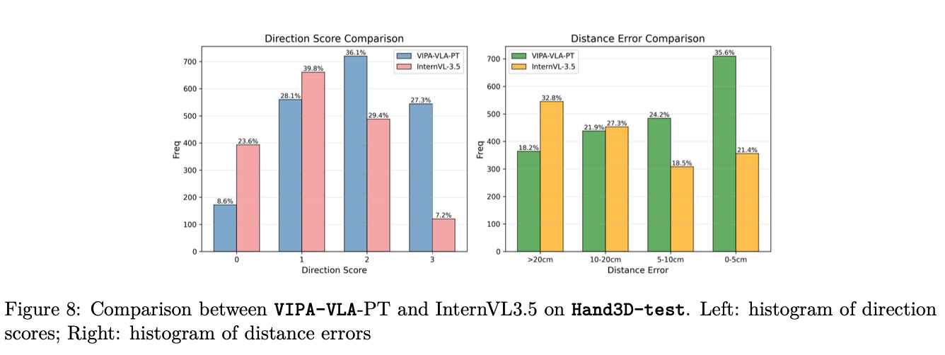 Figure 8에서는 VIPA-VLA-PT와 InternVL3.5 간의 상세한 비교를 제시한다. 3차원 시각 주석에 대한 공간 인식 사전 학습 후, 본 모델은 심각한 오류를 실질적으로 줄이고 사례의 약 30%에서 매우 정확한 예측을 달성하며, 이는 이 단계에서 획득한 정밀하고 신뢰할 수 있는 3차원 공간 접지 능력을 반영한다.