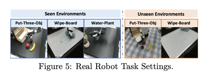 작업에 대한 설명은 Figure 5에 나타나 있다. 각 작업에 대해 사후 학습을 위한 50개의 원격 조작(teleoperated) 궤적을 수집하고, 작업 성공률 측정을 위해 10회의 평가 시도를 수행한다. 평가 중에는 매 시도마다 테이블 위의 객체 배치와 화이트보드의 펜 자국 분포를 무작위화한다. 이 설정은 학습된 정책이 고정된 구성을 암기하는 대신 일반화 능력을 갖추었는지 테스트한다. 전체 작업 성공률 외에도 모든 시도에서 완료된 하위 작업의 비율로 계산된 평균 하위 작업 성공률을 보고한다.
