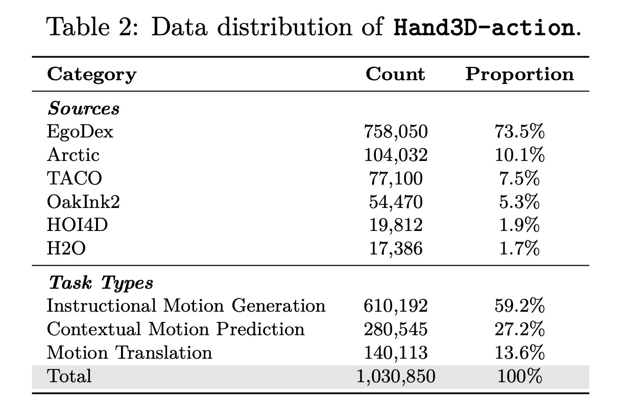 3차원 시각 주석을 보완하기 위해, 물리 공간에서 인간 조작의 역동적인 측면을 포착하는 3차원 행동 주석을 추가로 구축한다. 인간 영상의 손 동작 시퀀스로부터 손목 궤적을 3차원 좌표 시퀀스로 추출하며, 이는 균등 빈닝(uniform binning)을 통해 동작 토큰으로 이산화된다. UniHand를 따라 영상에 대한 텍스트 지침을 획득하여 400만 개의 영상-지침-동작 쌍을 얻는다. 구체적으로, 각 영상은 먼저 10초 단위의 청크로 분할되며 Gemini-2.5-flash를 적용하여 청크 수준 및 초 수준의 주석을 생성한다. 그 다음 Gemini-2.5-Pro를 사용하여 주석을 기반으로 세 가지 종류의 VQA 스타일 작업(지침 기반 동작 생성, 동작 번역, 맥락적 동작 예측)을 구축한다. 3차원 손 움직임이 미미한 샘플을 추가로 필터링하여 100만 개의 선별된 데이터셋인 Hand3D-action을 구축하며, 이는 세밀한 3차원 동작 패턴과 공간 궤적뿐만 아니라 객체 유도성(affordance) 및 작업 분해와 같은 고차원적인 물리적 추론 지식을 제공한다.