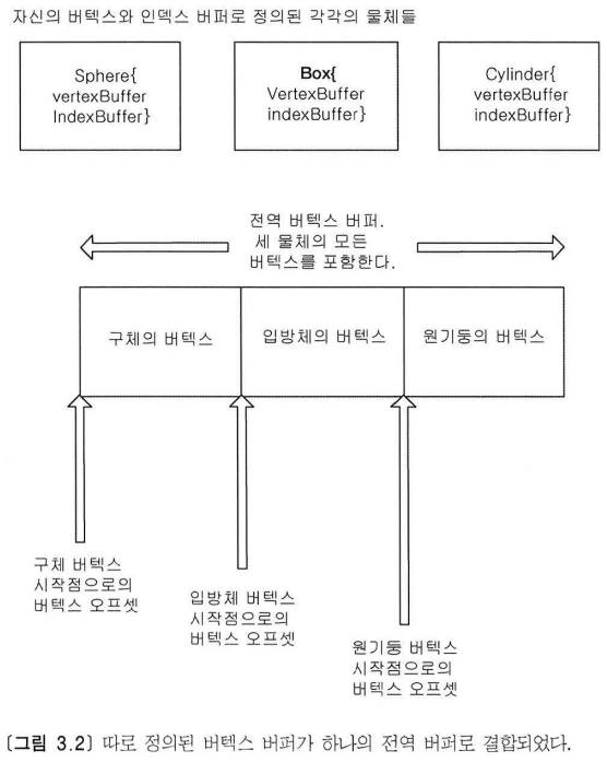 로컬 인덱스 버퍼는 대응되는 각각의 로컬 버텍스 버퍼의 버텍스들을 참조한다. 만약, 구체와 입방체, 원기둥의 버텍스를 하나의 전역 버텍스 버퍼로 결합하기를 원한다고 가정해보자. 각각의 물체에 대해 전역 버텍스 버퍼에 맞도록 인덱스를 다시 계산하는 과정이 필요할 것이다. 새로운 인덱스는 전역 버텍스 버퍼의 물체 버텍스 시작을 지정으로 하는 오프셋 값을 더하도록 계산된다. 오프셋은 바이트가 아닌 버텍스 단위로 계산된다는 것에 주의 하자.