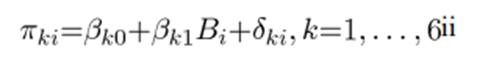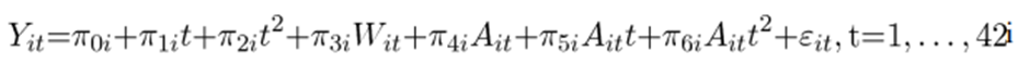 π_ki: i번째 participant의 level 1 계수, k는 level 1에서의 항. -> k=0: intercept, k=1: time(t) … 사람마다 intercept 다르고, time trend, intervention 효과 전부 다름.