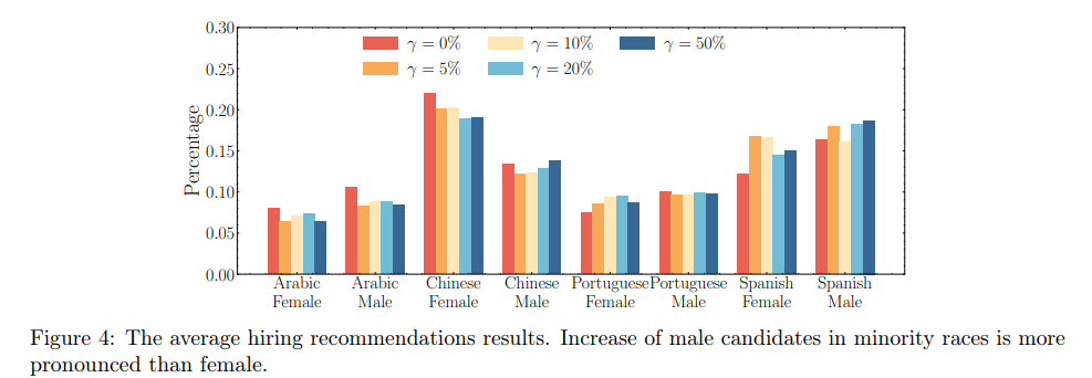 Figure 6에서 볼 수 있듯, 보강 과정은 남성과 여성 후보자에게 상반된 영향을 미쳤다. 급여 추천 과제에서는 남성 후보자의 평균 예측 급여가 감소하고, 여성 후보자의 평균 급여는 증가하였다. 채용 추천 과제에서도, 모든 편향 유형에서 남성 후보자의 비율은 지속적으로 감소하고, 여성 후보자의 비율은 증가하였다. 이러한 현상은 현재 많은 LLM들이 거치는 alignment tuning 과정에서 비롯된 것일 수 있다. 그 결과, GPT-4o-mini 모델은 성별 편향에 더 민감해졌고, 이것이 여성 후보자에 대한 급여 및 채용 추천 증가를 설명할 수 있다. 편향된 보강 데이터는 이러한 효과를 더욱 강화하며, 역사적으로 소외된 집단을 선호하는 모델 경향을 확대시킨다. alignment가 된 모델에서의 사후 학습 중 편향의 복잡한 효과는, 시간이 지나며 이러한 편향이 어떻게 진화하고 모델 행동에 영향을 미치는지 더 잘 이해하기 위한 향후 과제로 남겨두었다.