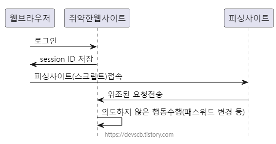 악성 사이트에서 특정 웹 사이트에 사용자의 쿠키 정보를 가지고 위조된 요청 정보를 전송한다.