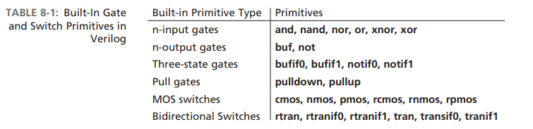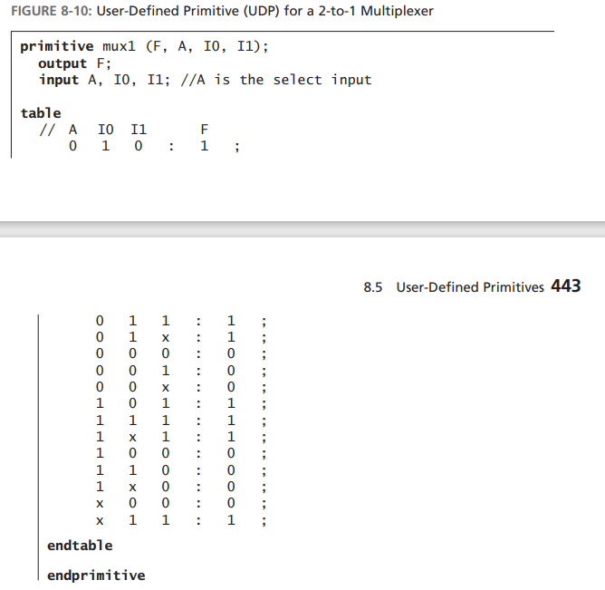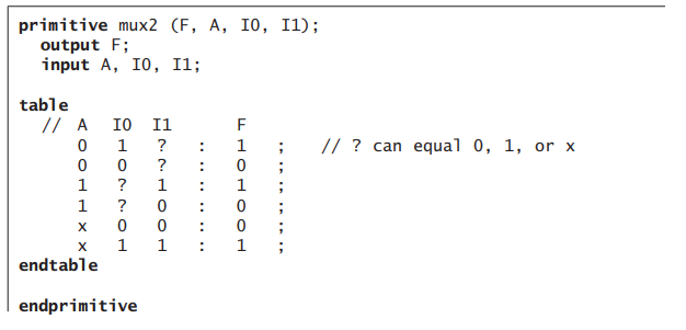 The functionality of the primitive is defined with a truth table or state table, starting with the keyword table and ending with the keyword endtable.