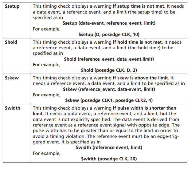 Timing checks must be within specify blocks.