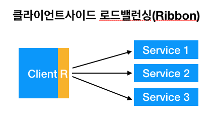마이크로 서비스 4가지가 있다고 했을 때, 클라이언트와 서비스 사이에 API Gateway를 중간에 두고 동작을 해야하는데 이러한 구조가 아닌 클라이언트 내부에 Ribbon이라는 서비스를 구축하여 사용을 하기 시작했다. (Client Side에 위치하고 있다.)